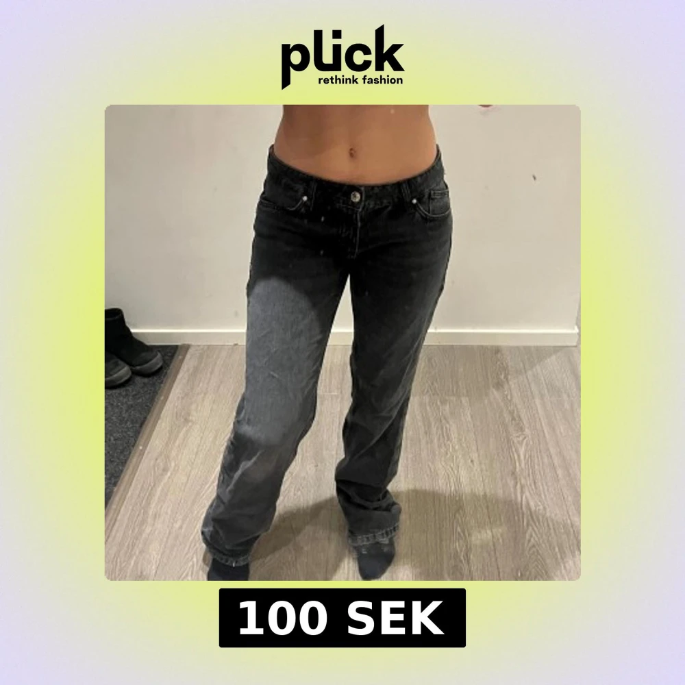Snygga svarta jeansbyxor från Zara. De har en rak passform och är lågmidjade, vilket ger en avslappnad look. (Smutsig spegel)