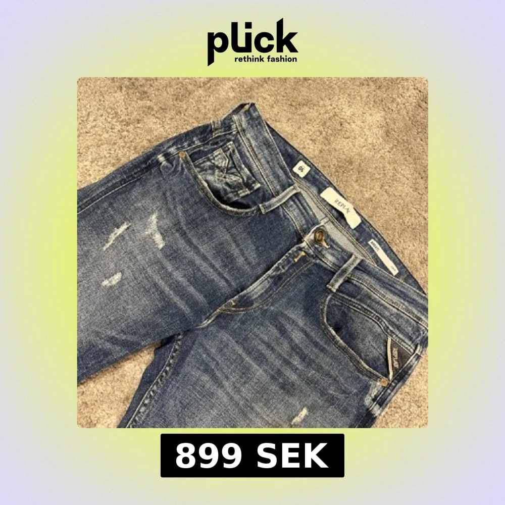 Säljer ett par blå Replay jeans age 05 med snygga slitningar och klassiska fem fickor. Jeansen har raka ben och coola detaljer som kontrastsömmar och läderpatch bak. Perfekta för dig som gillar en avslappnad men trendig look.