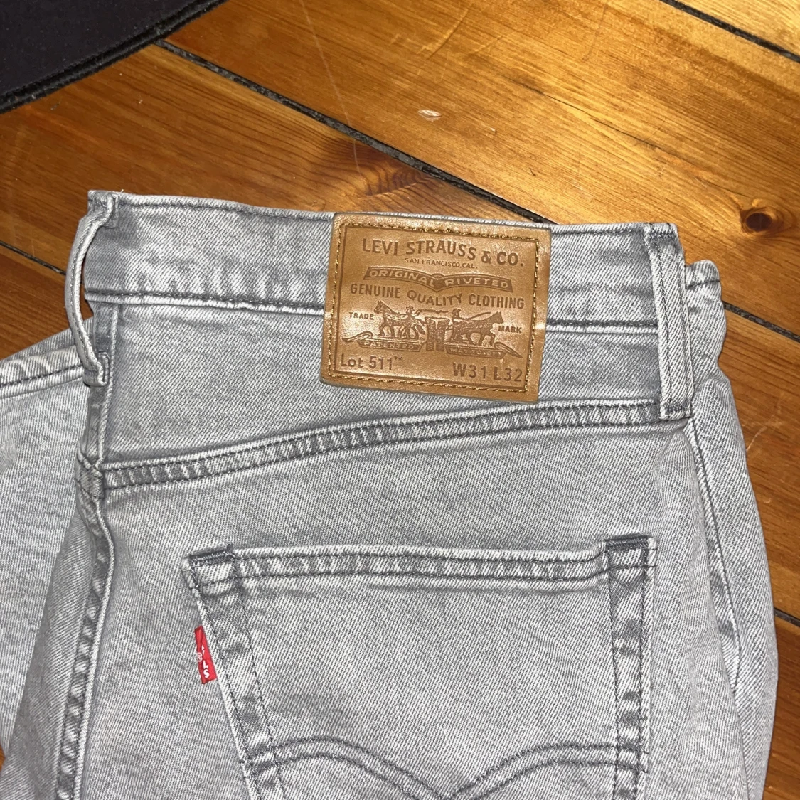 Snygga ljusgrå Levi's 511 jeans med klassisk femficksdesign och raka ben. Jeansen har en slim passform och är tillverkade i mjukt bomullsmaterial. Perfekta för dig som gillar en clean och stilren look. Ikonisk läderpatch bak i midjan och röd Levi's-tagg på bakfickan. Kom gärna med frågor och pruta för en snabb affär