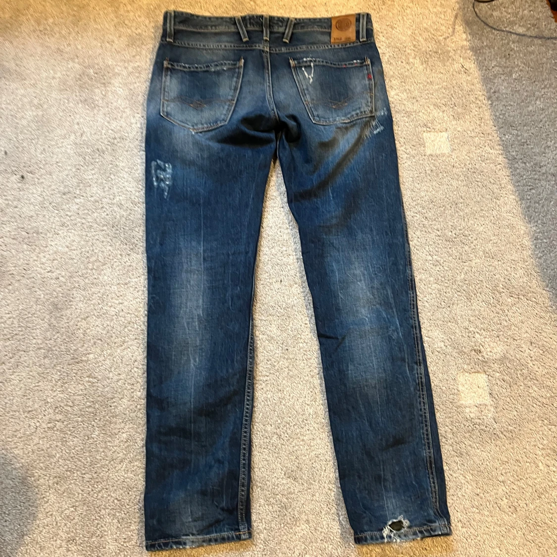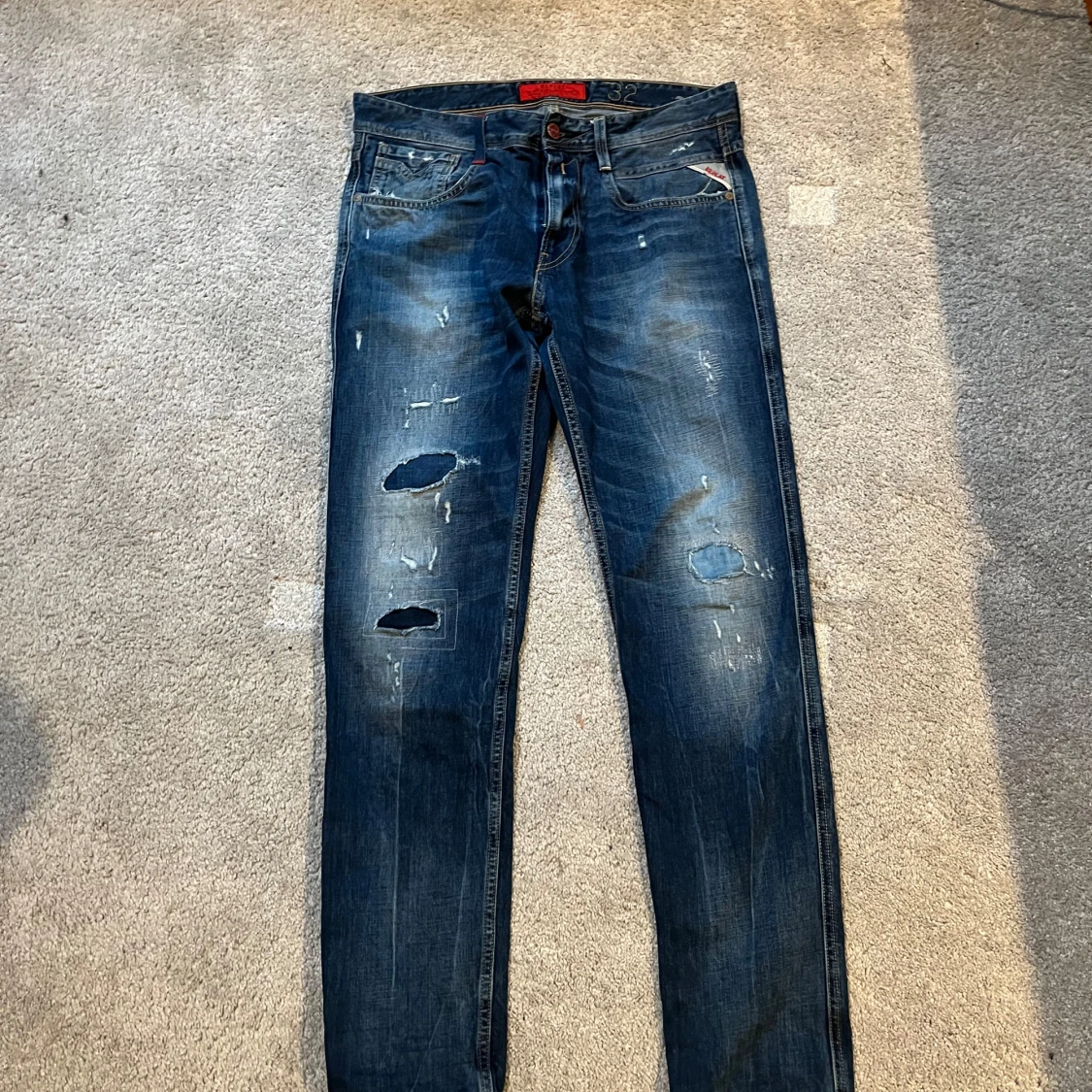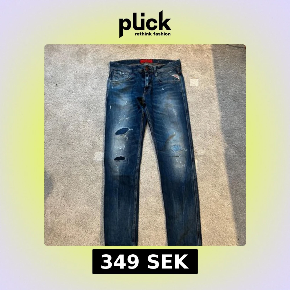 Säljer ett par snygga blå jeans från Replay med slitna detaljer och en slim passform, jeansen har ett litet hål vid foten på baksidan, hålet syns INTE med skor på. Hör av dig vid funderingar. Pris kan diskuteras