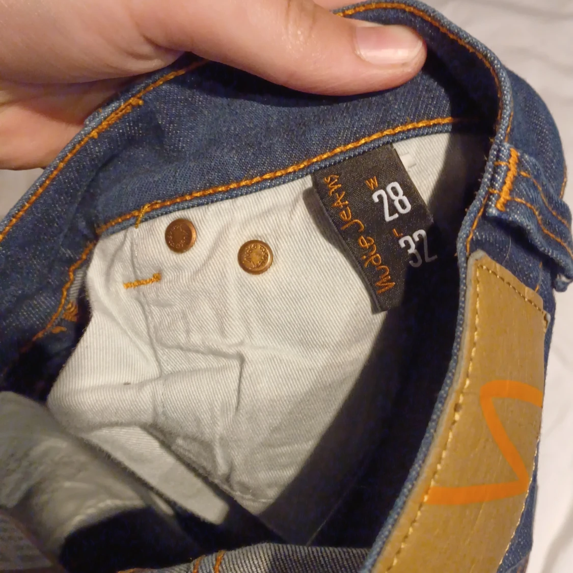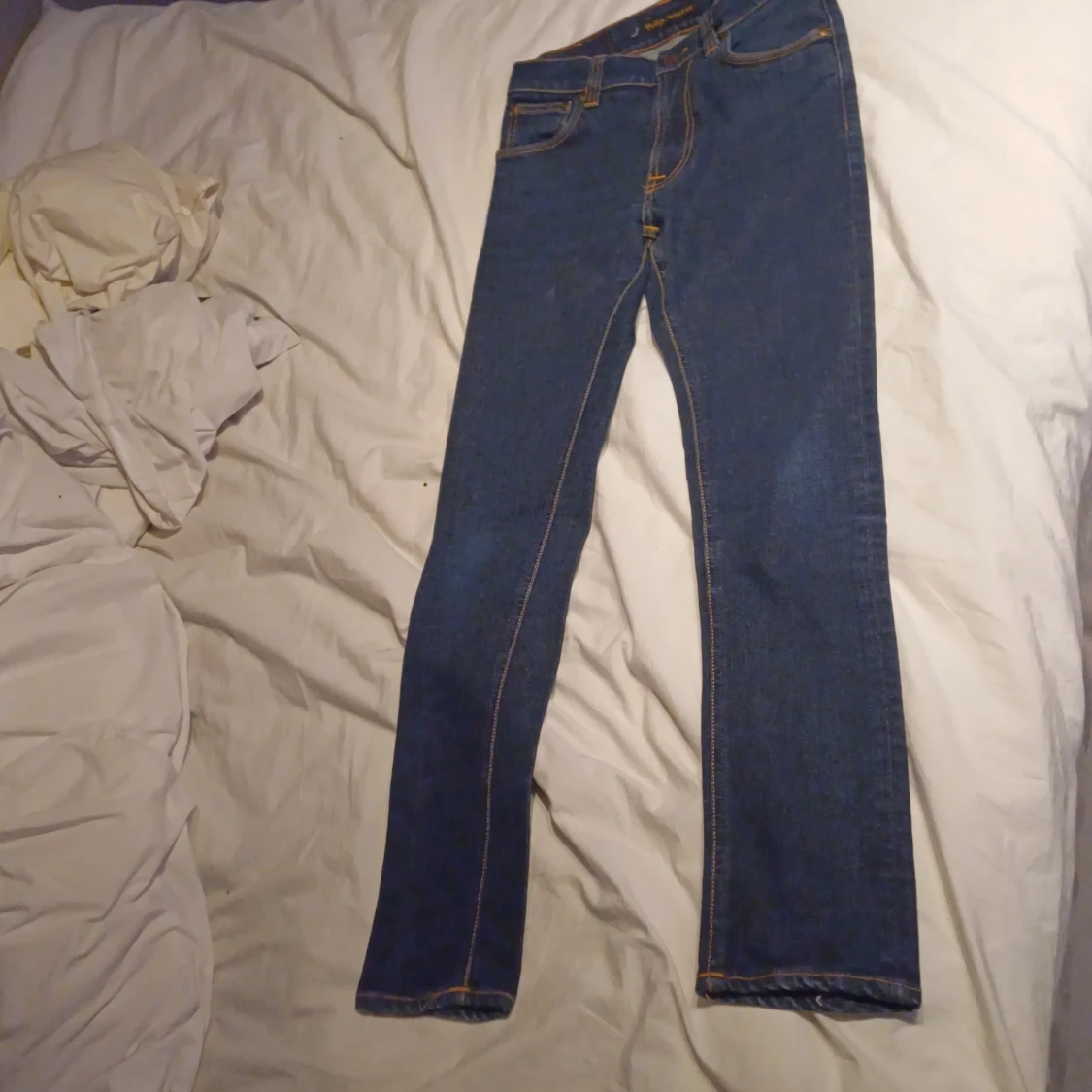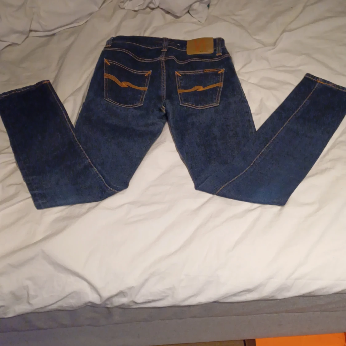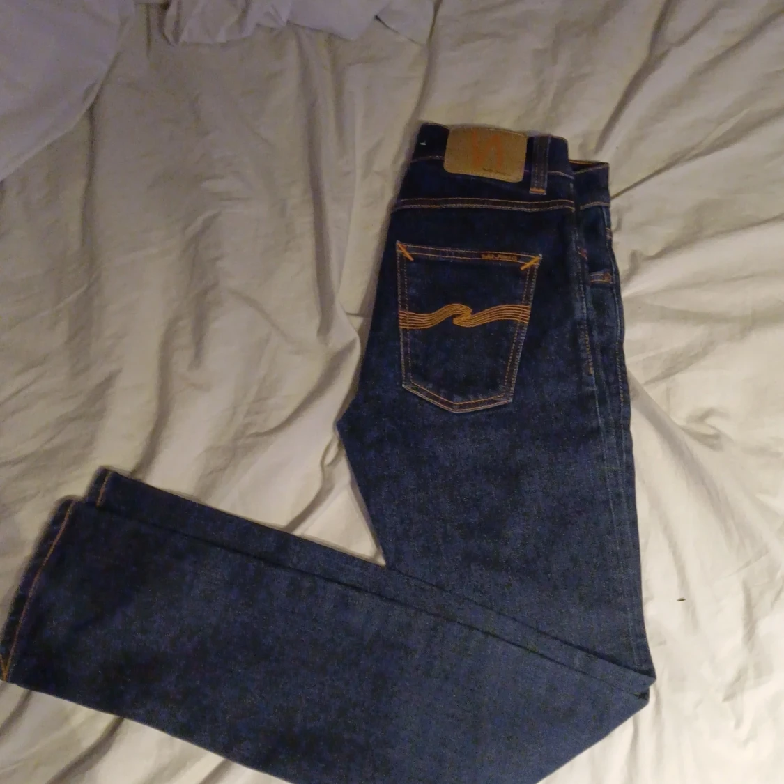 Säljer ett par klassiska mörkblå jeans från Nudie Jeans med raka ben och snygga kontrastsömmar. Byxorna har fem fickor och Nudie-loggan broderad på bakfickorna. Perfekta för dig som gillar stilrena och tidlösa jeans. I storlek W28 L32 i modellen Lean dean dem är helt nya men prislapp och sånt ha jag råka kasta jag är prutbar vid snabbaffär skriv om du har några frågor eller funderingar