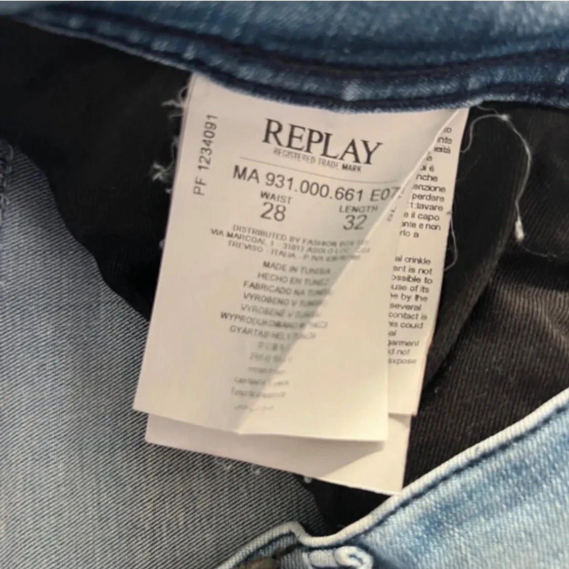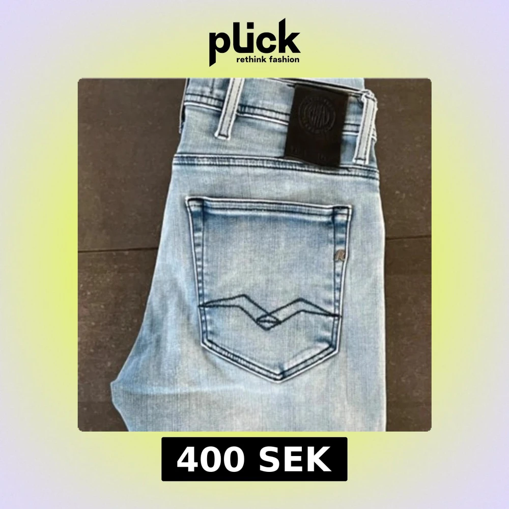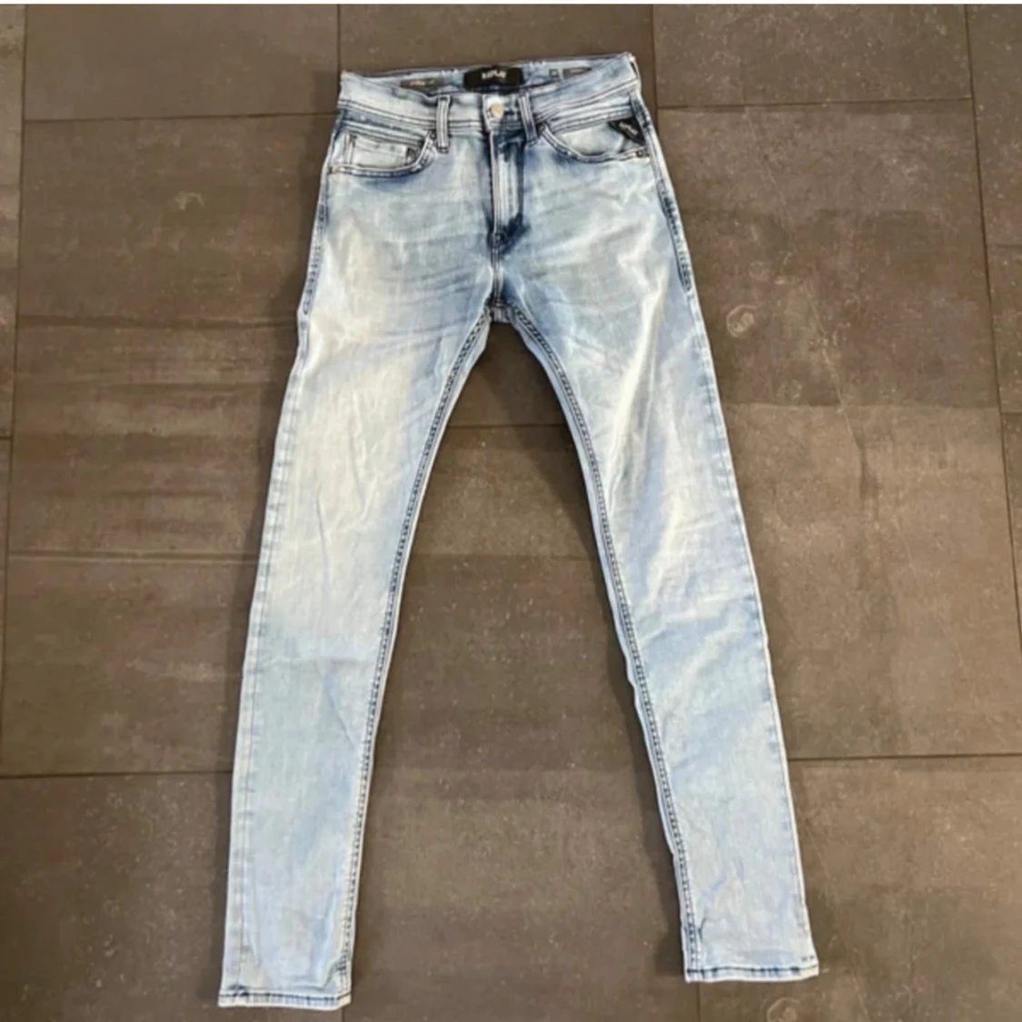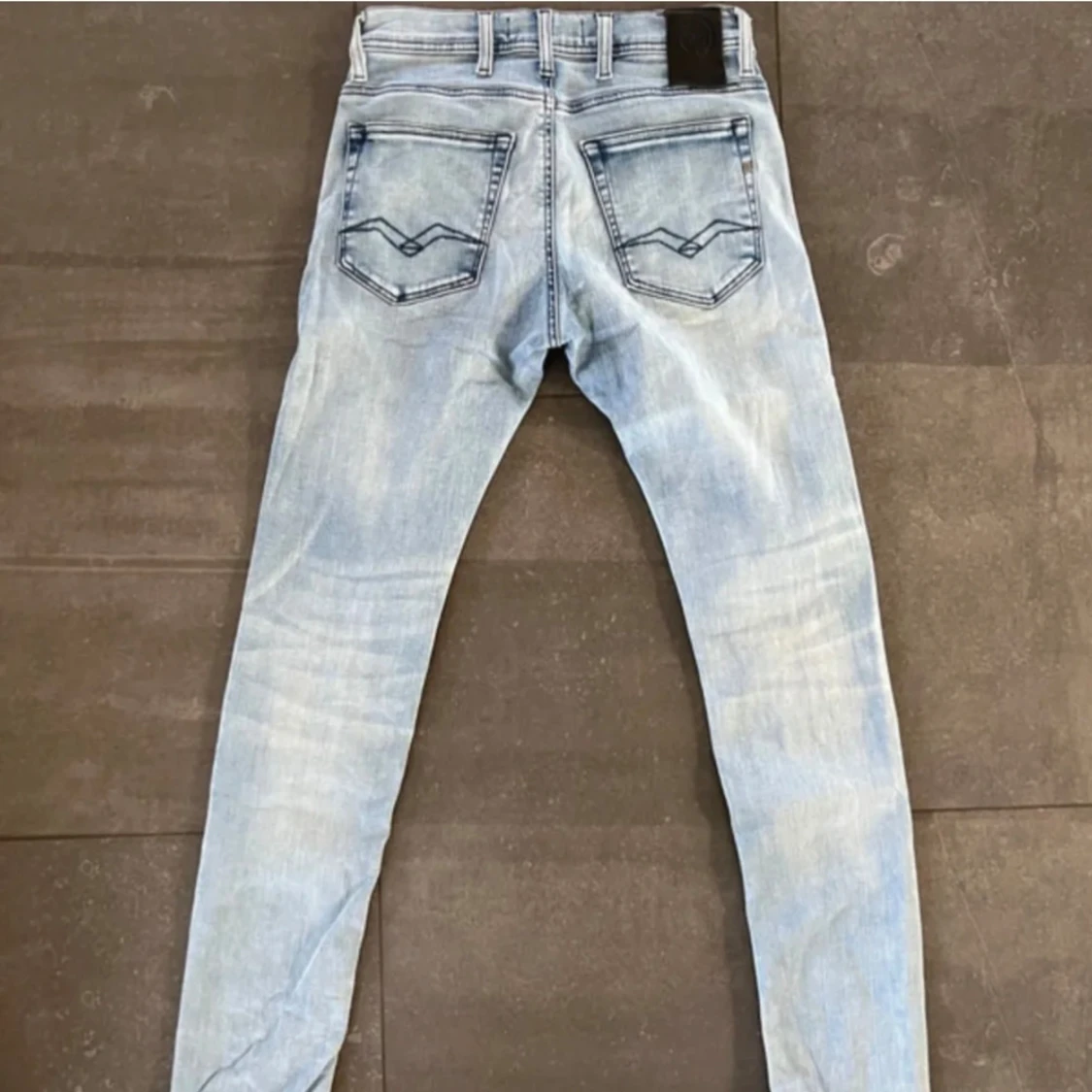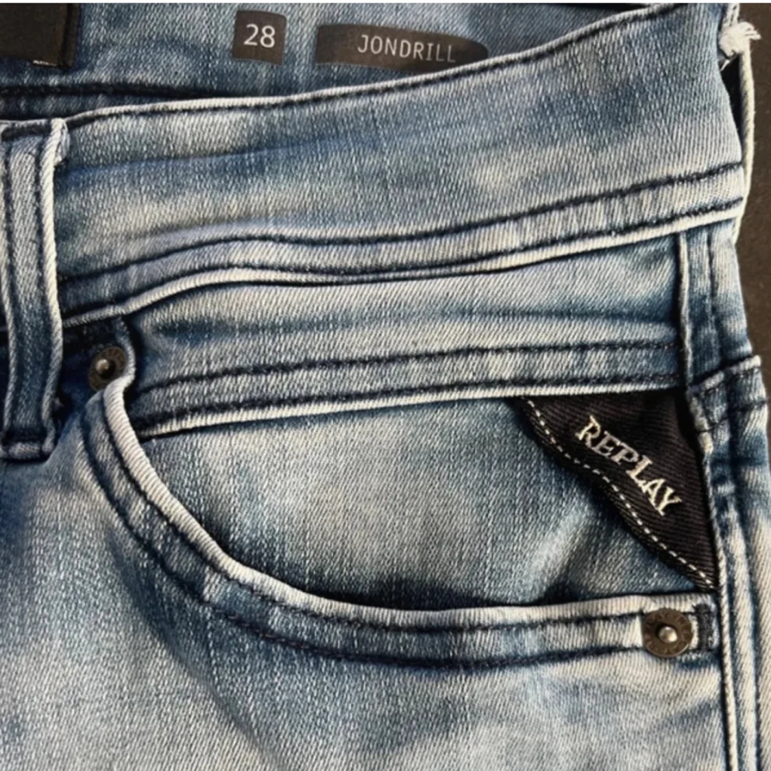 Säljer ett par Replay Jondrill jeans i ljusblå tvätt med skinny passform. Jeansen har klassiska fem fickor, snygga slitningar och Replay-logga på fickan. Perfekta för dig som gillar en smal siluett och vill ha ett par riktigt fräscha jeans.
