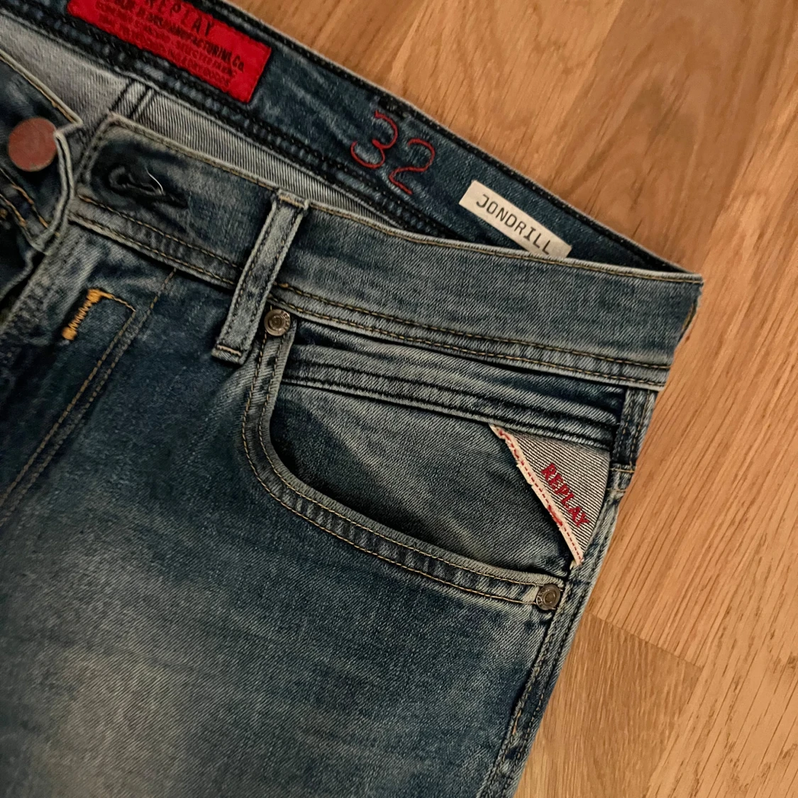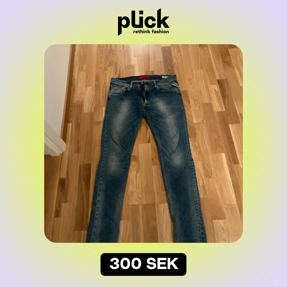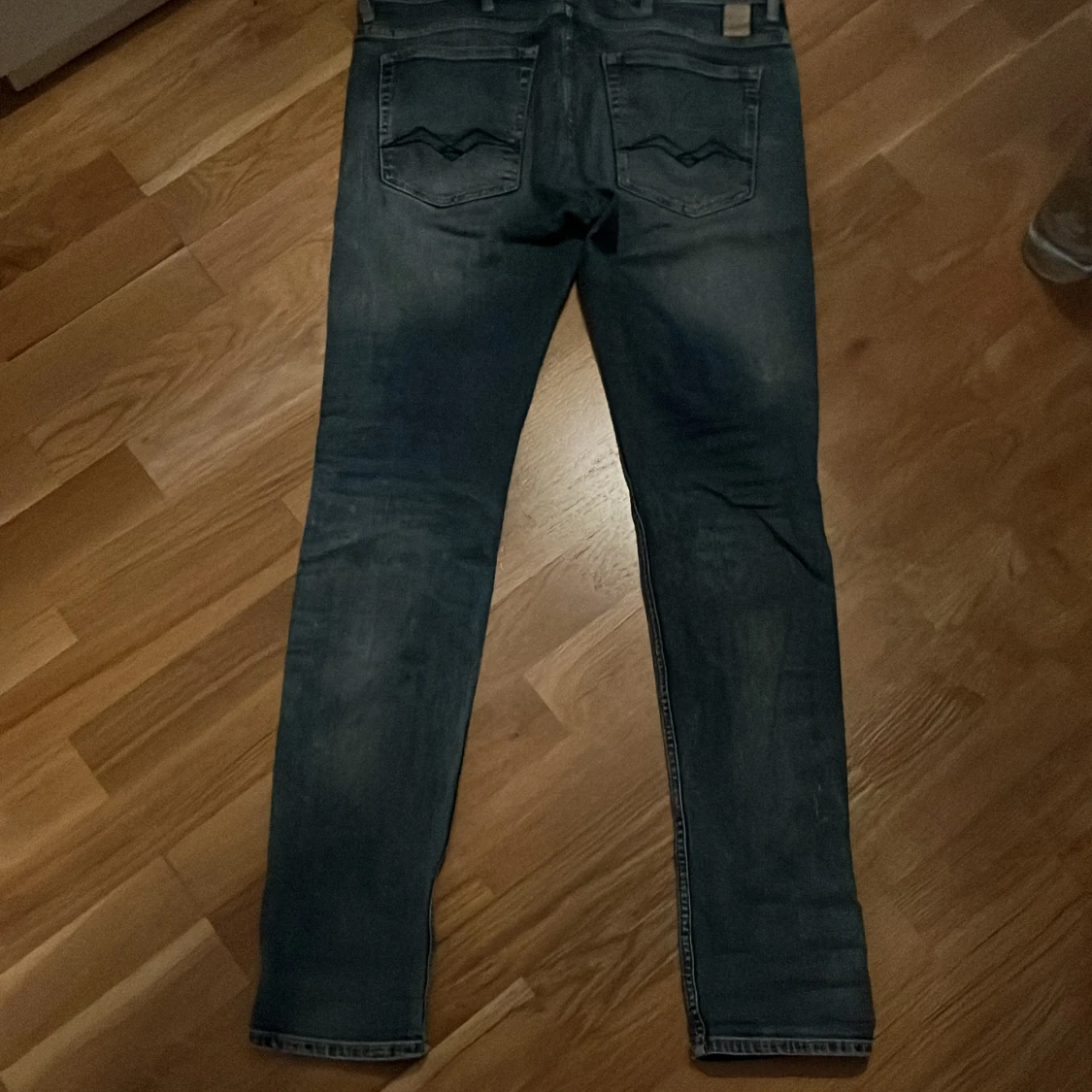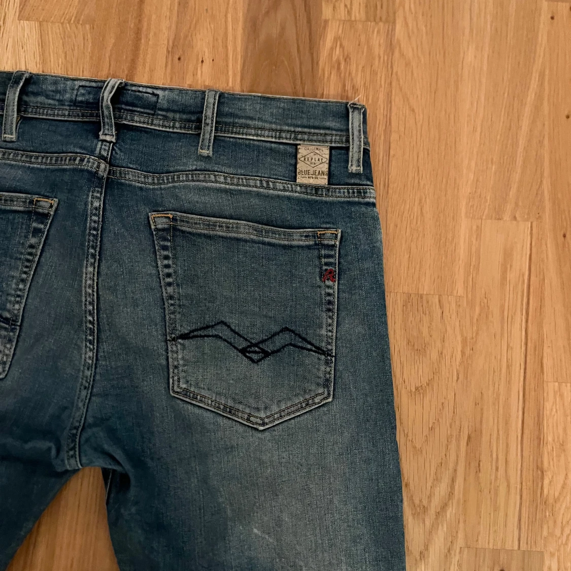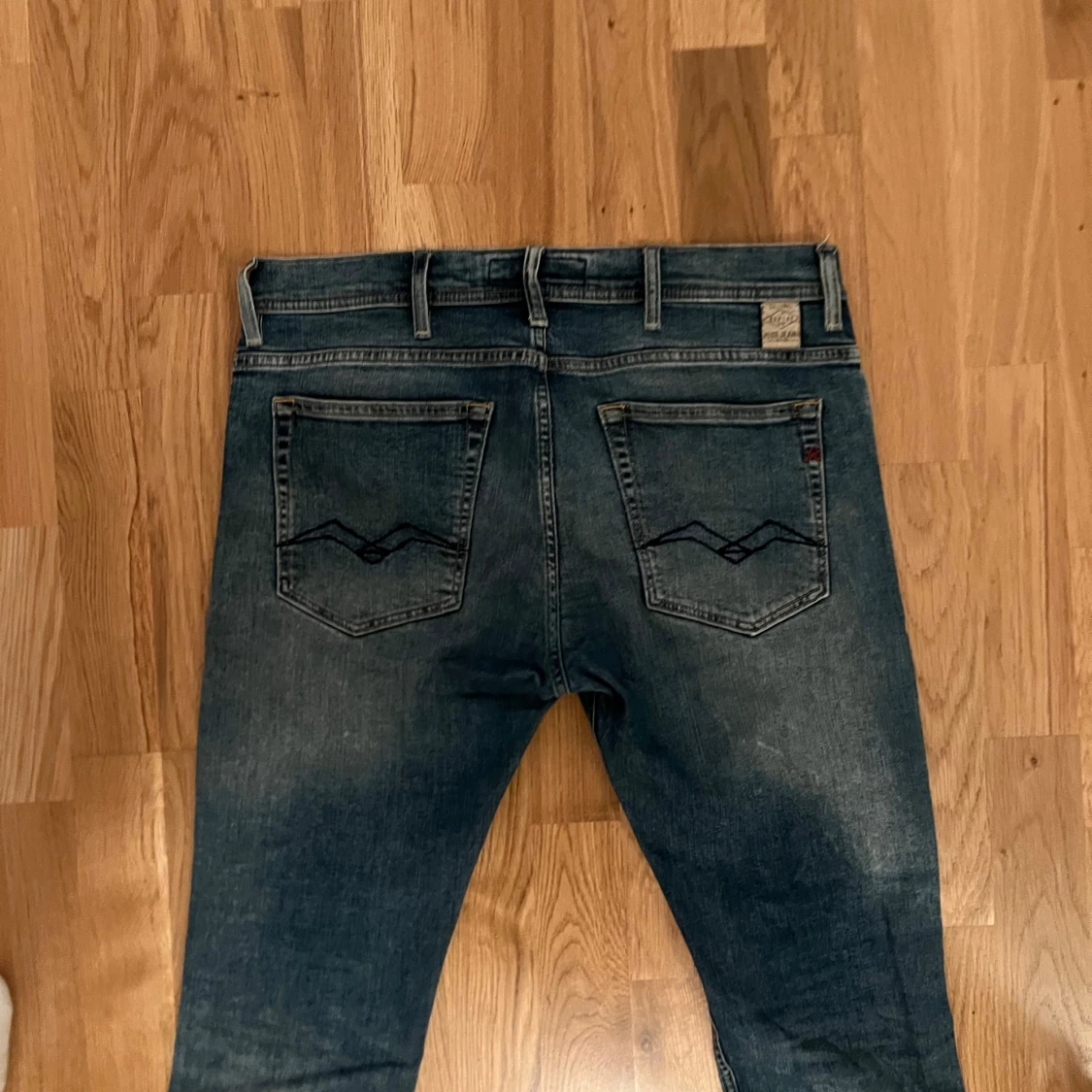 Tjena. Säljer ett par sköna blå/ljusblå replay jeans. Waist: 32 Length: 32. Flitigt använda och inga skador på byxorna. Pris kan diskuteras. Står ej för frakt.