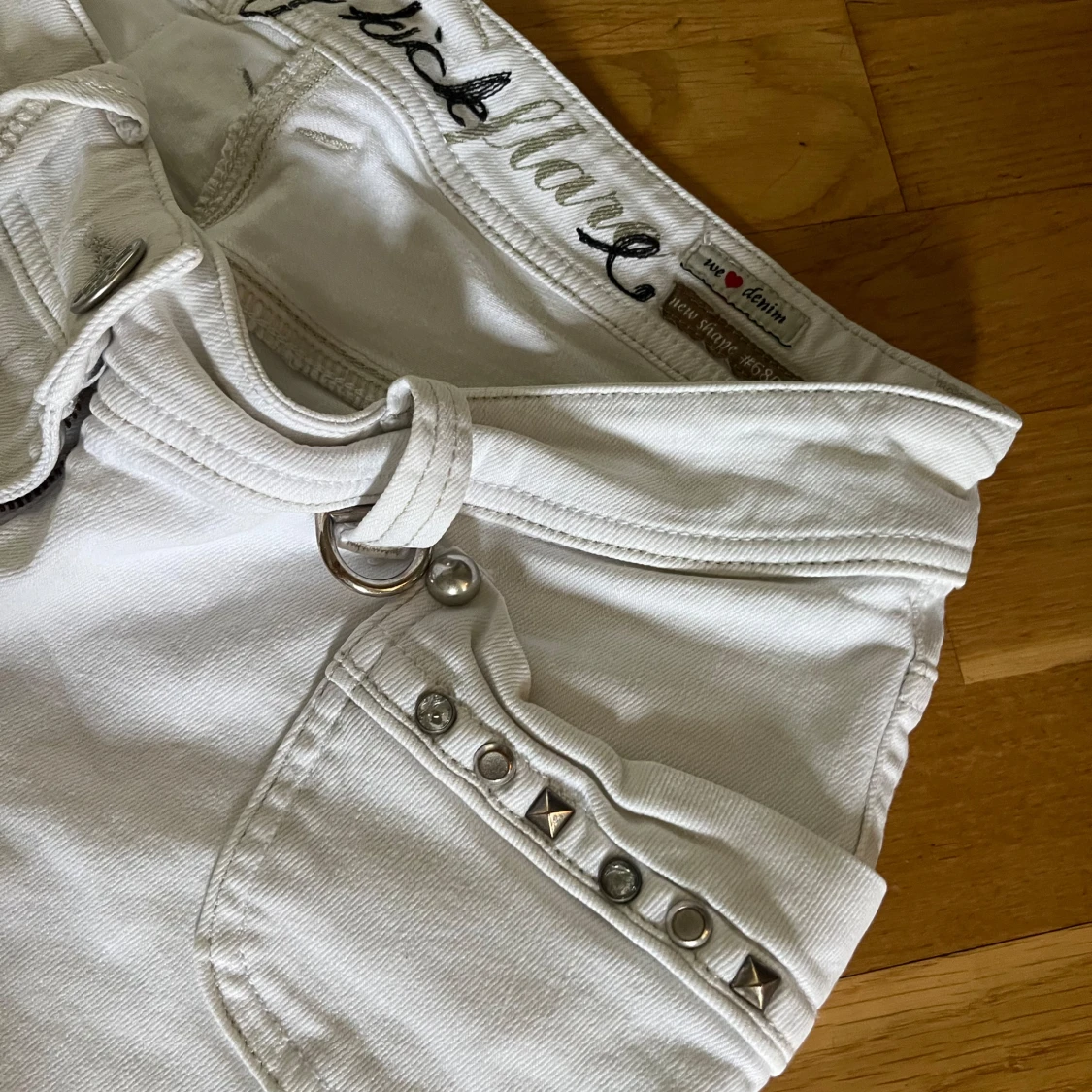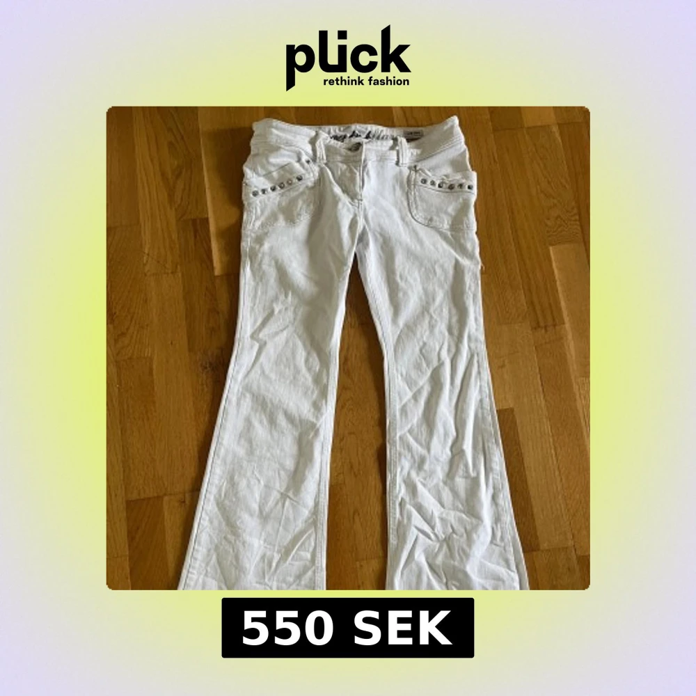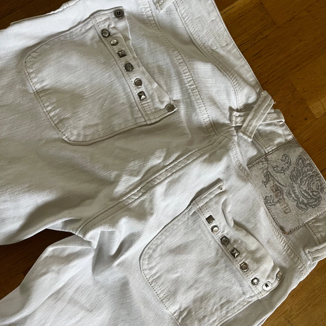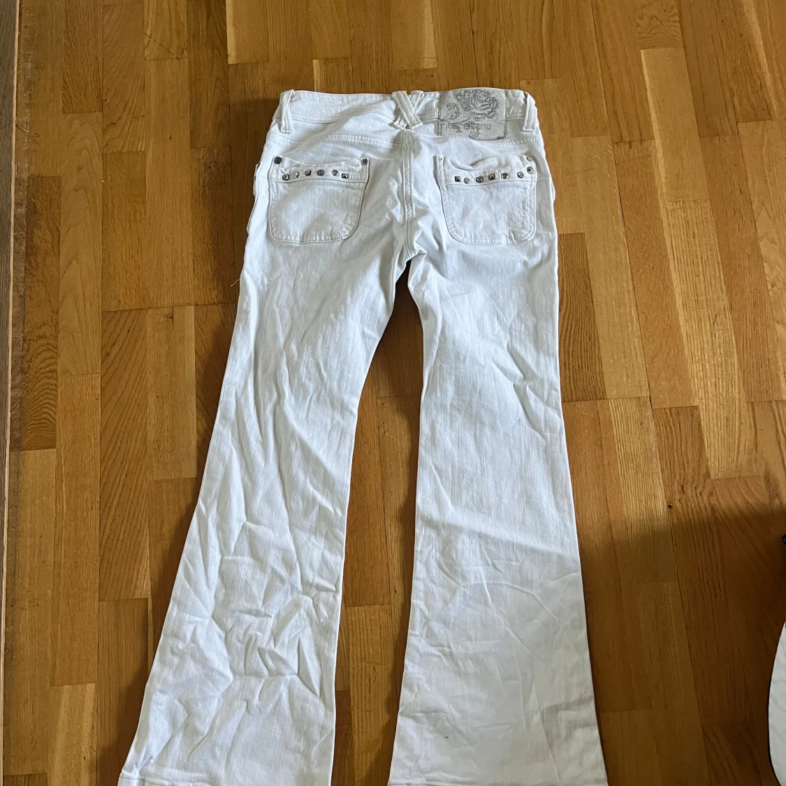 Snygga vita lågmidjade jeans med bootcut passform. Byxorna har coola silverfärgade nitar på fickorna fram och bak samt broderad detalj vid linningen. Tillverkade i bomull med klassisk jeanskänsla och låg midja. Säljer då dom är för små för mig. Pris kan diskuteras!
