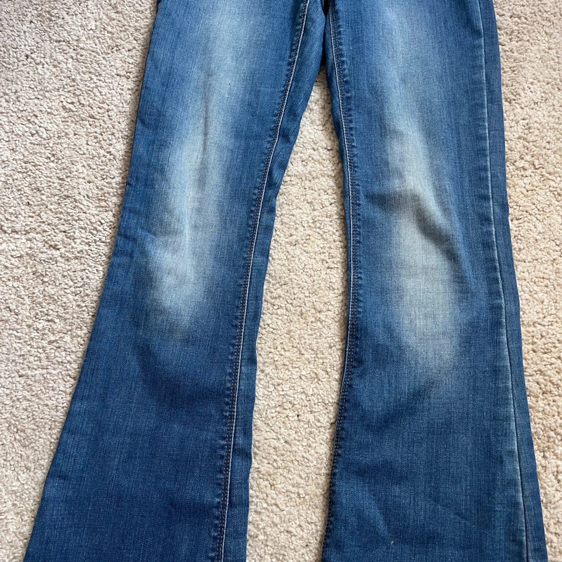 Säljer ett par klassiska blå bootcut jeans från LMTD. Jeansen har lätt slitna partier framtill och två bakfickor. Perfekta för dig som gillar en retroinspirerad look med utsvängda ben.