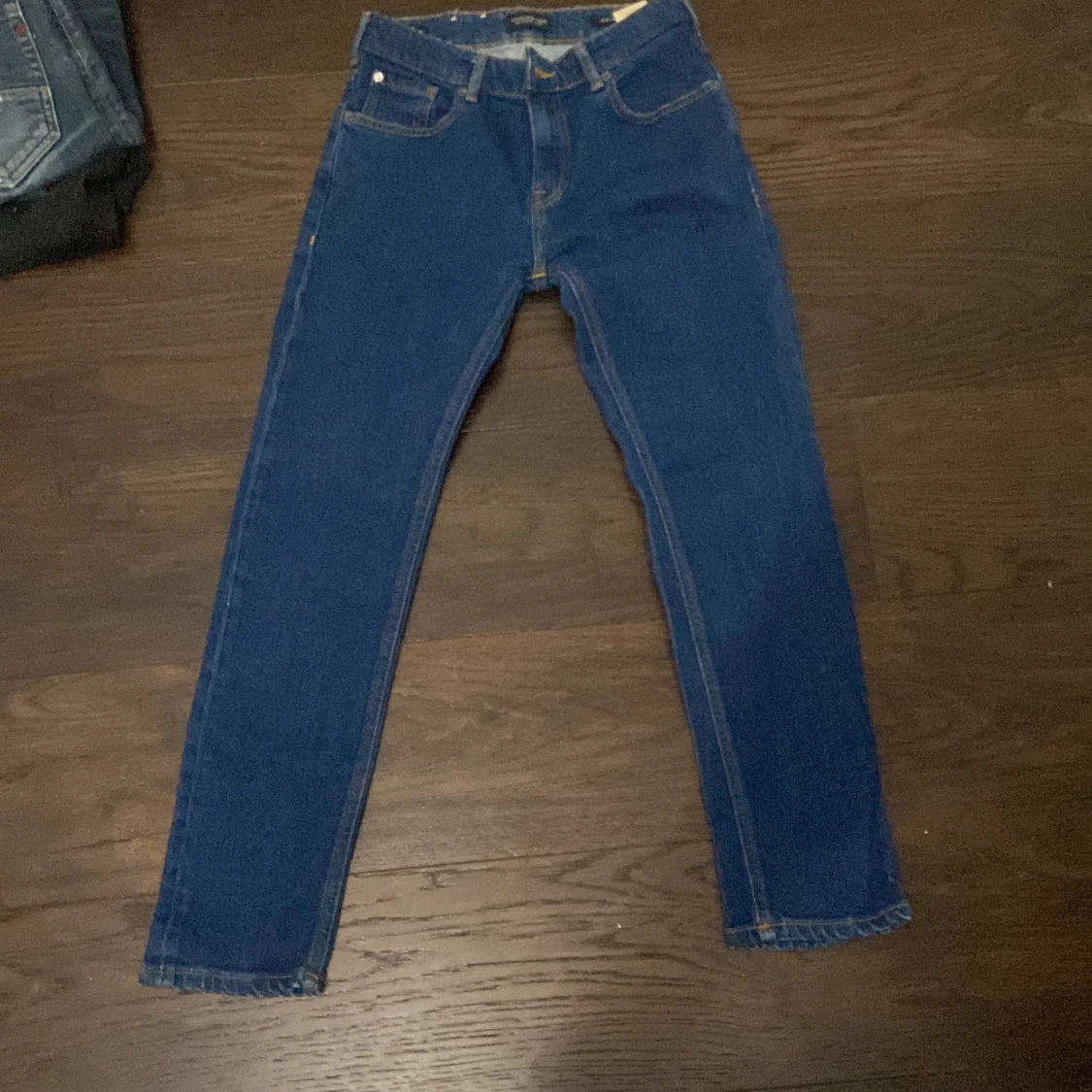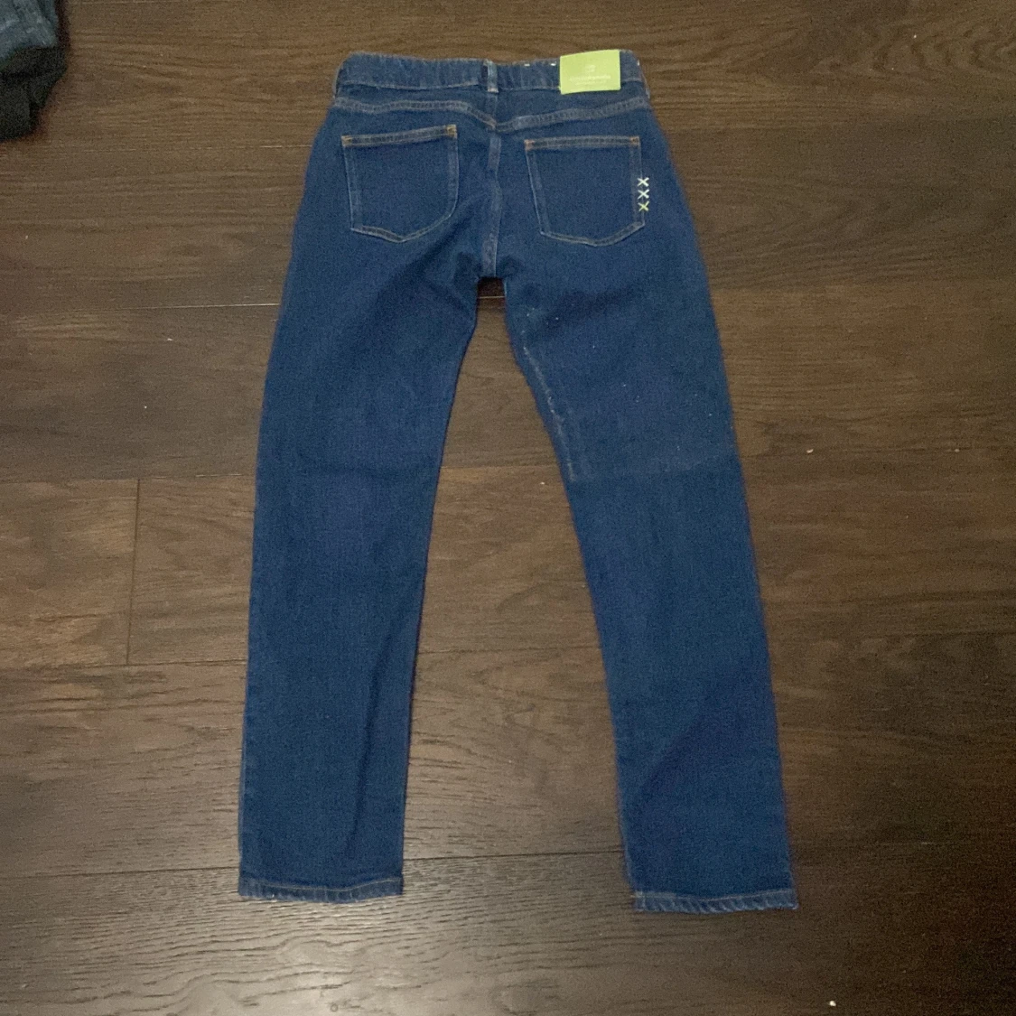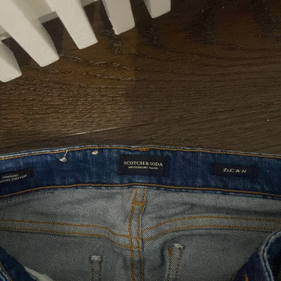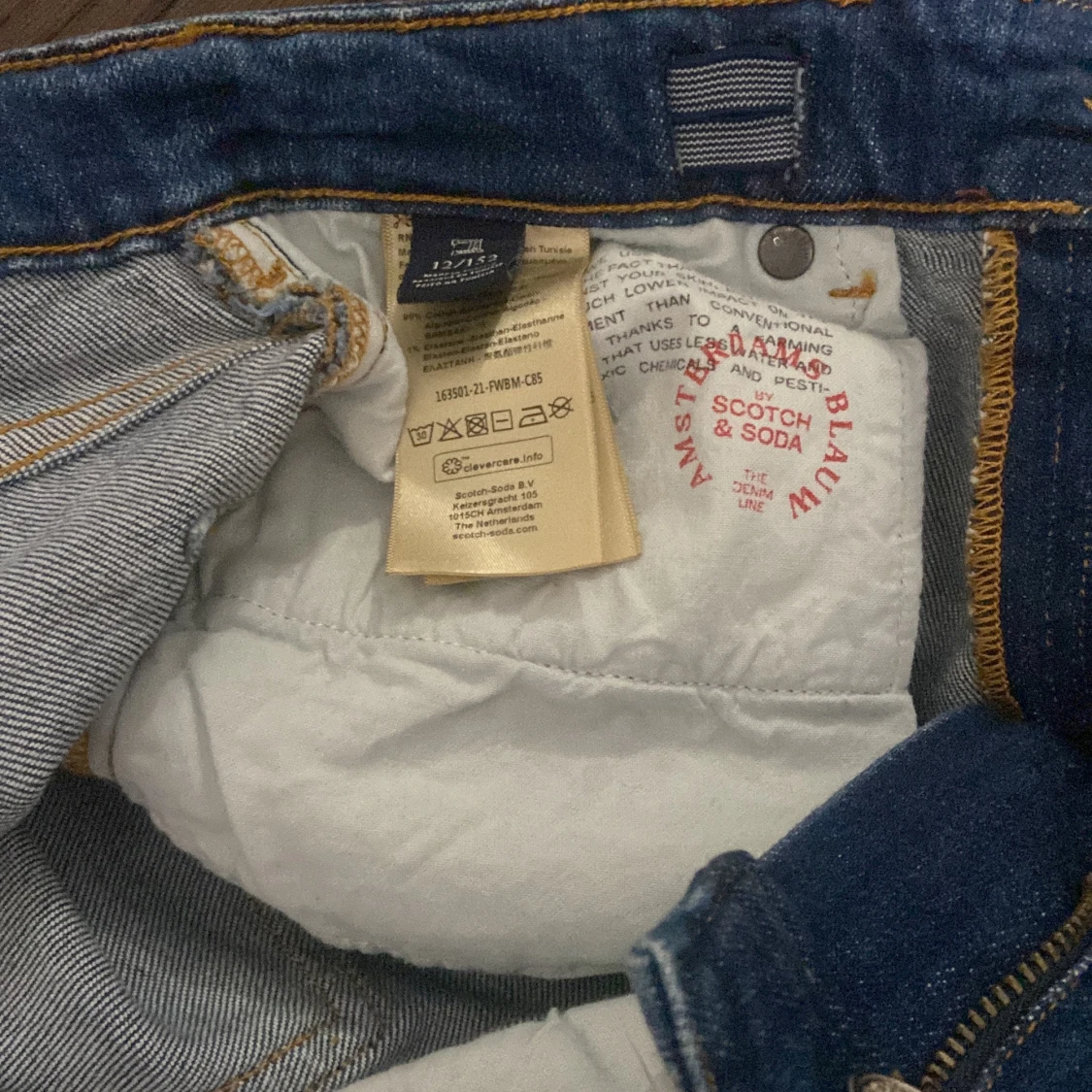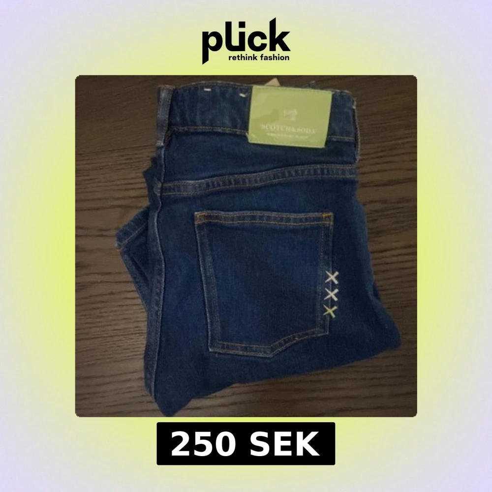 Snygga blå slim jeans från Scotch & Soda med klassisk femficksdesign och coola broderade kryss i vitt, blått och grönt på bakfickan. Jeansen är i stretchig bomull och har en normal passform med smal siluett. Perfekta för en trendig vardagslook. Kom med frågor eller bud!