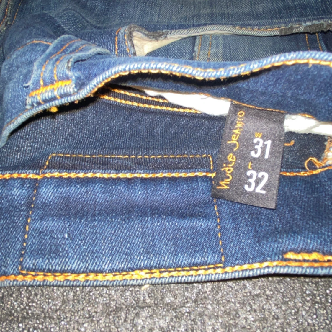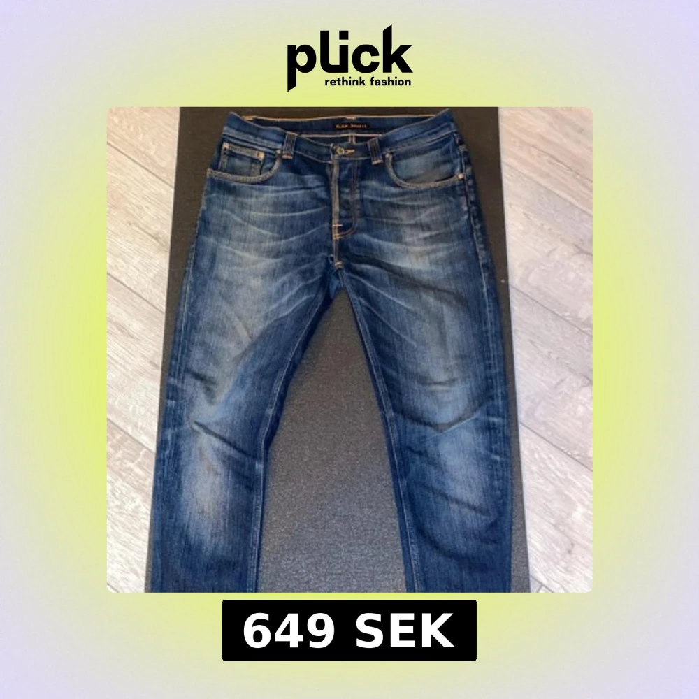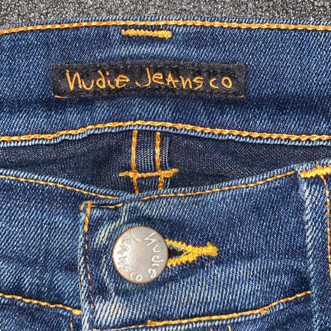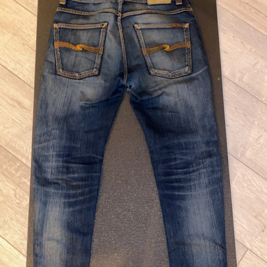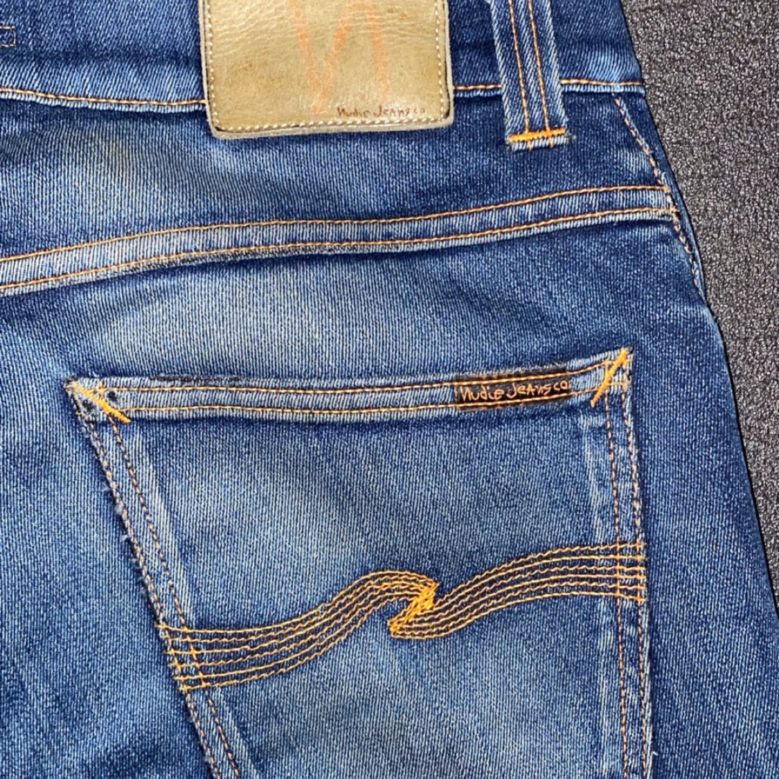 Säljer ett par snygga blå jeans från Nudie Jeans Co med klassisk orange söm och cool slitning framtill. Jeansen har raka ben och fem fickor, samt Nudie-logga på bakfickan. Perfekta för dig som gillar en avslappnad men stilren look. De är storlek W31-L32. Sitter slimfit och har en bra passform. Skriv till mig om du har några funderingar!😆