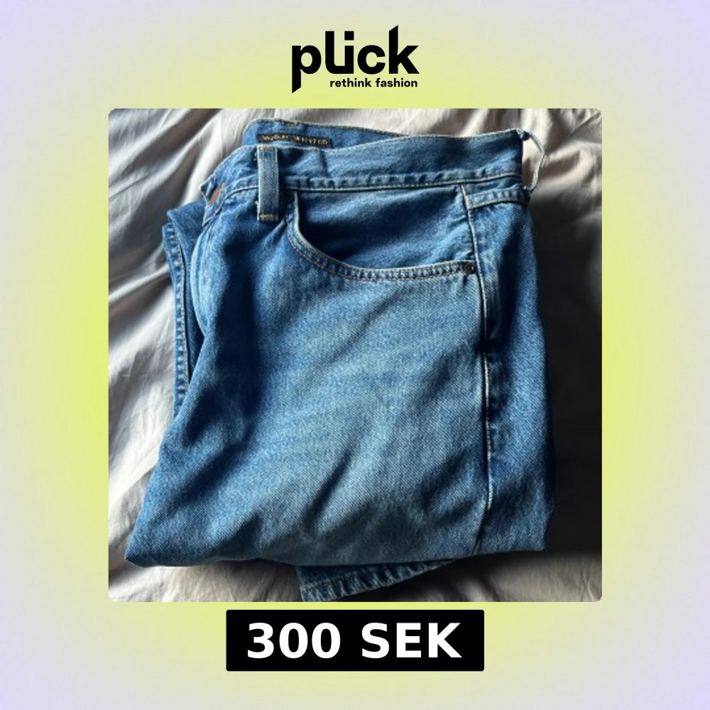 Säljer ett par klassiska blå jeans från Nudie Jeans med snygga orangea sömmar och logga på bakfickan. Jeansen har fem fickor, normal passform och är tillverkade i slitstarkt bomullsjeansmaterial. Perfekt för dig som gillar tidlös stil och kvalitetsjeans.