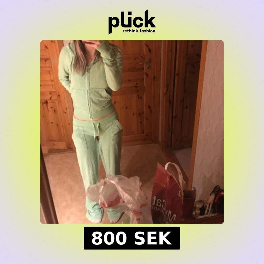 Säljer ett set med grön mjukisbyxa och matchande hoodie från Juicy Couture. Byxorna har en bekväm passform med snörning i midjan och hoodien har dragkedja och huva. Perfekt för en avslappnad stil.