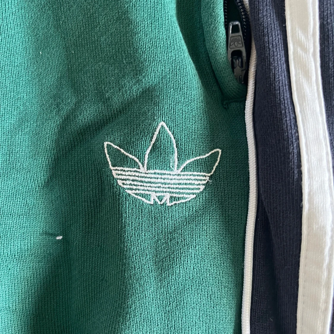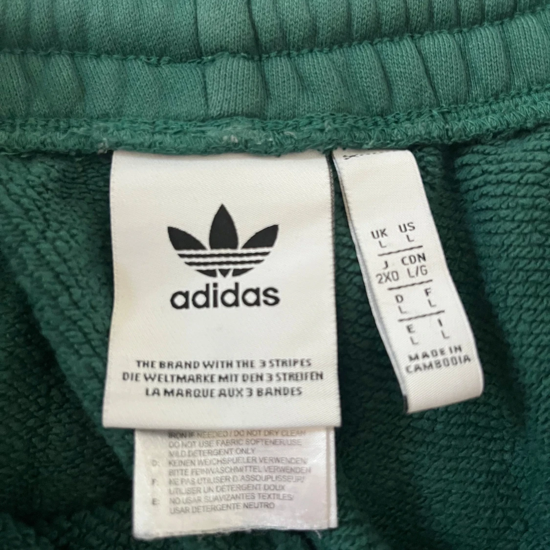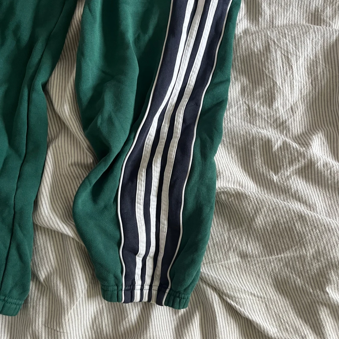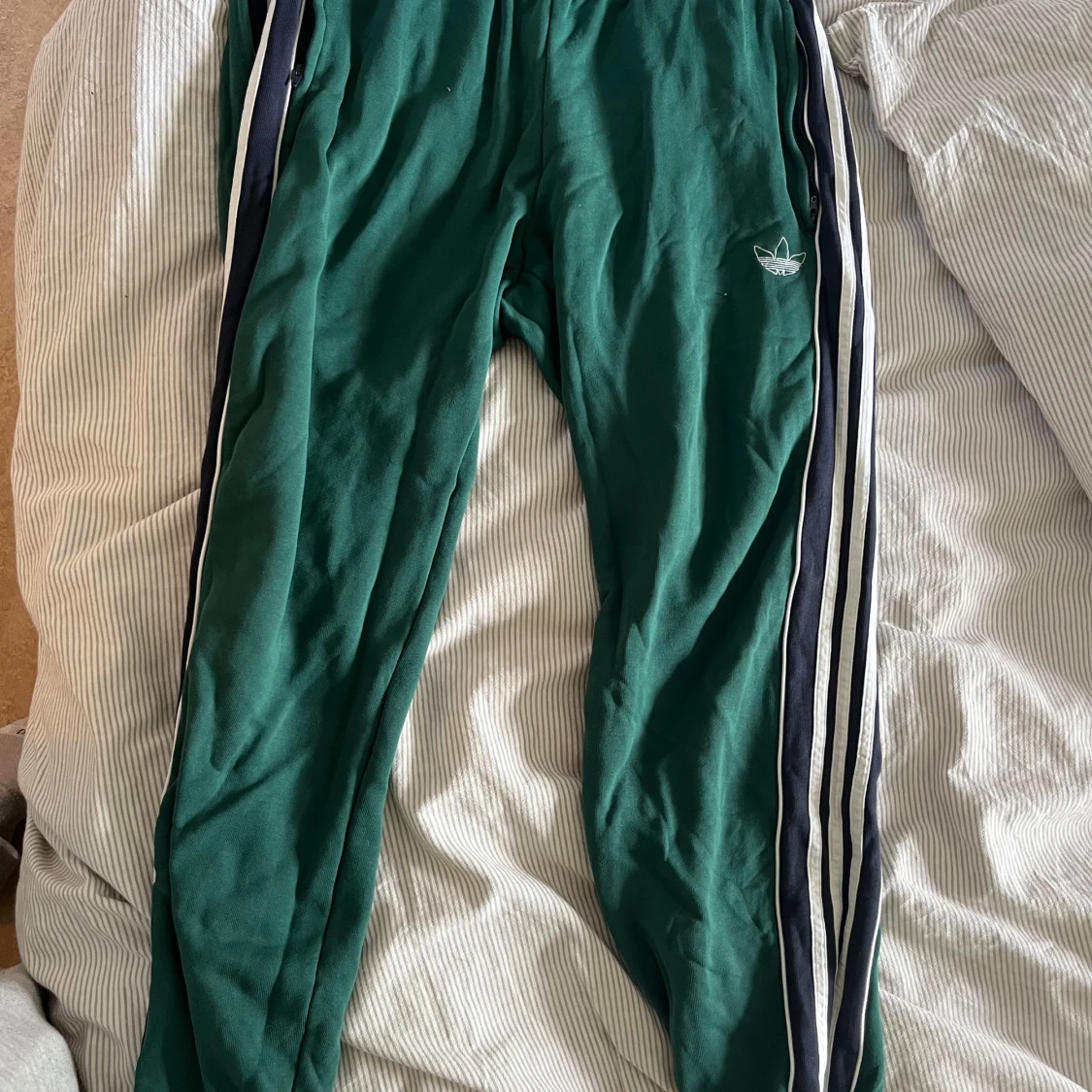 Gröna mjukisbyxor från Adidas med klassiska vita och svarta ränder längs sidorna. Byxorna har resår i midjan och vid bensluten samt broderad Adidas-logga på låret. Tillverkade i mjukt material som är skönt att ha på sig.