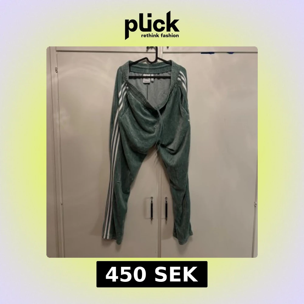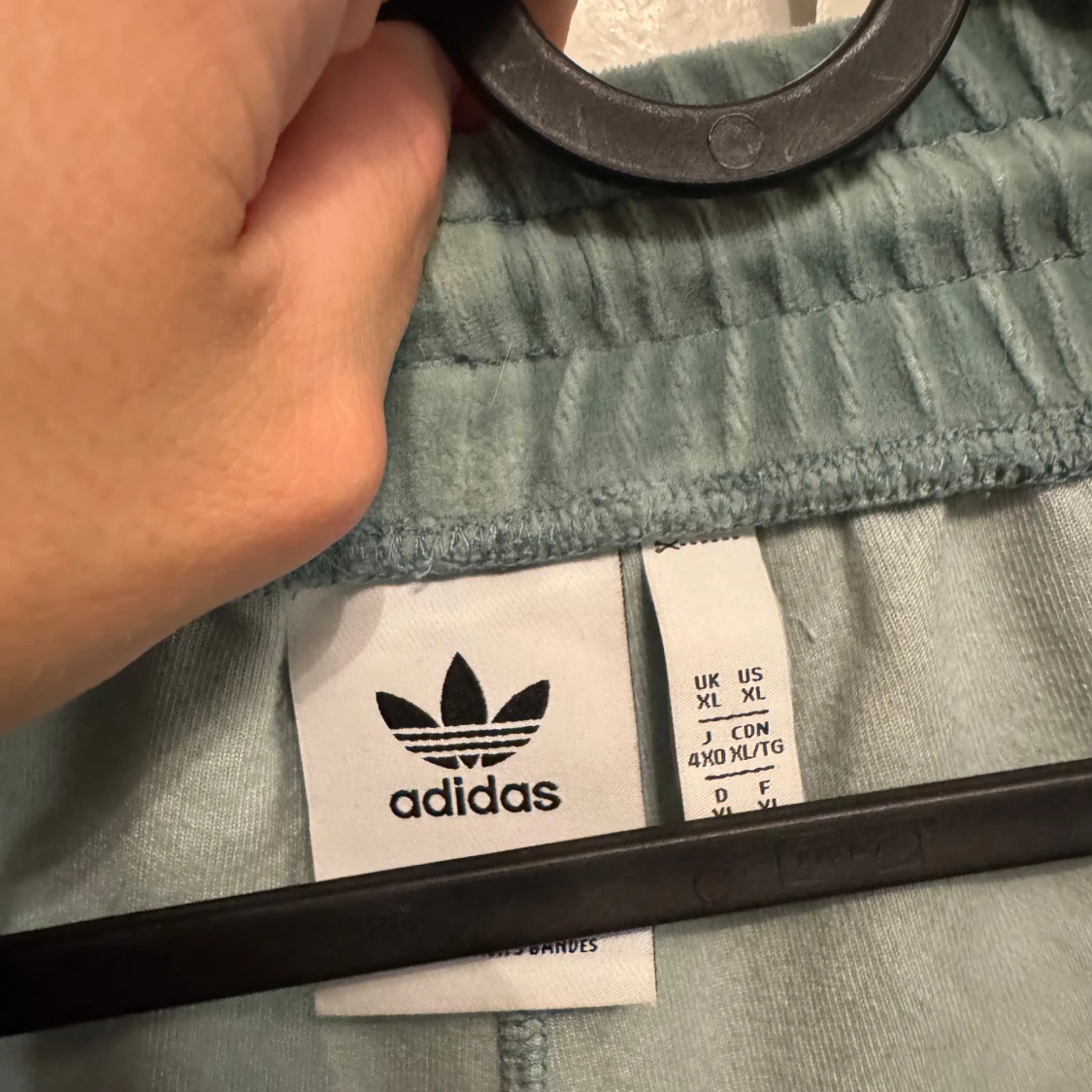 Snygga gröna mjukisbyxor från Adidas i storlek XL. Byxorna har klassiska vita ränder längs sidorna, resår i midjan och snörning. Velour, del av ett set