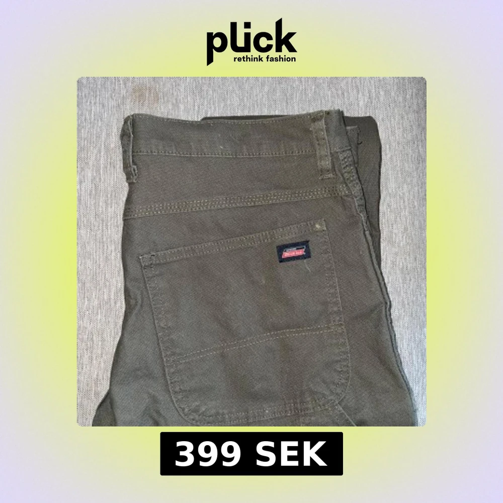 Säljer ett par klassiska gröna arbetsbyxor från Dickies med raka ben och stora bakfickor. Byxorna har en praktisk sidoficka och är tillverkade i slitstark bomull. Perfekta för dig som gillar utility-stil.