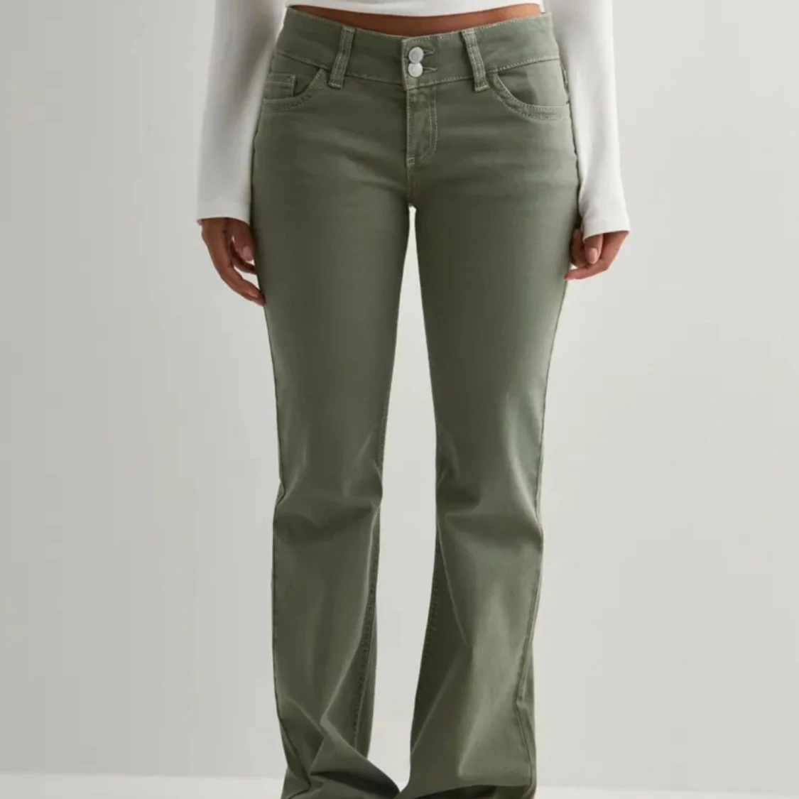 Snygga gröna byxor med bootcut-silhuett och hög midja. Byxorna har klassisk femficksdesign, dubbla knappar i midjan och raka ben som släpper ut vid ankeln. Perfekta för en trendig och avslappnad look. Använda enstaka gånger.