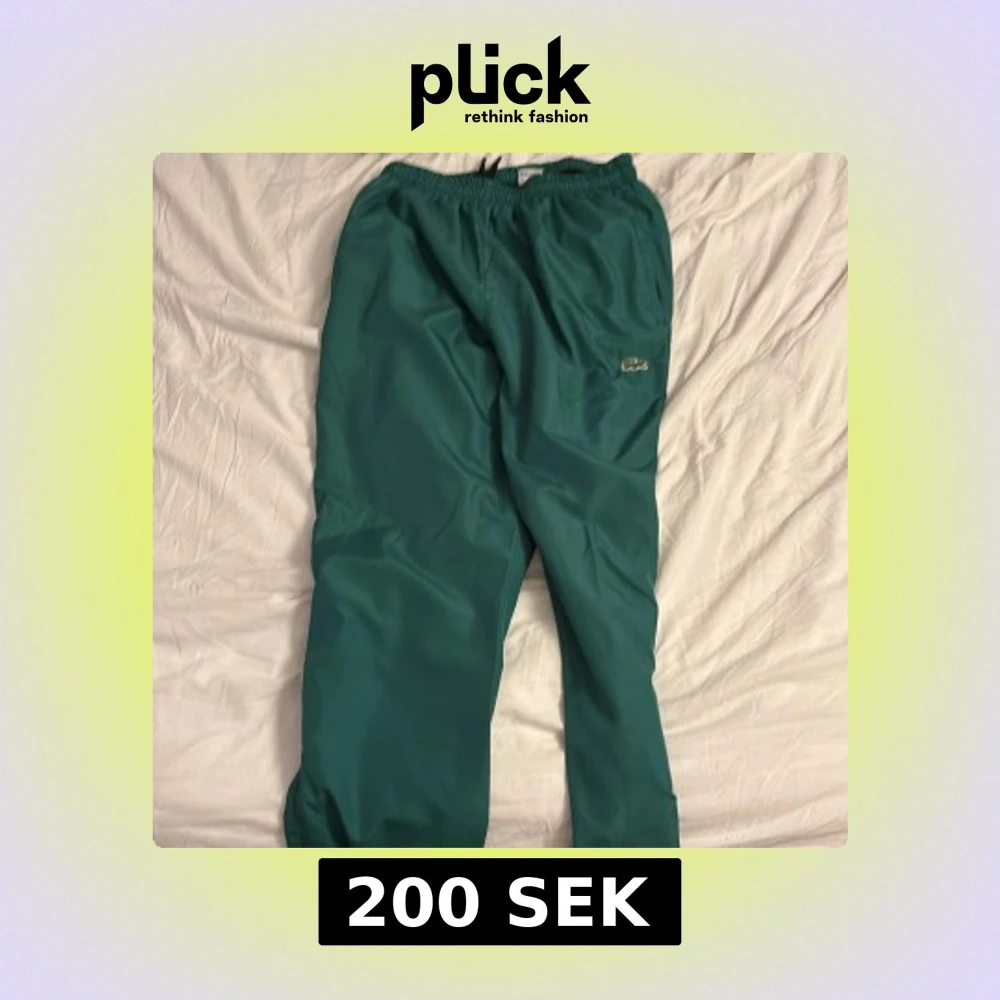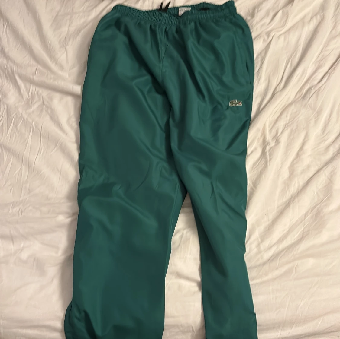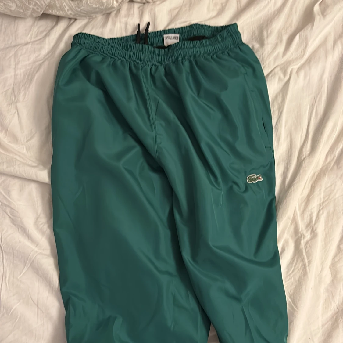Snygga gröna byxor från Lacoste med klassisk krokodillogga på benet. Byxorna har resår i midjan och är gjorda i ett glansigt syntetmaterial. Perfekta för en chill och sportig look.