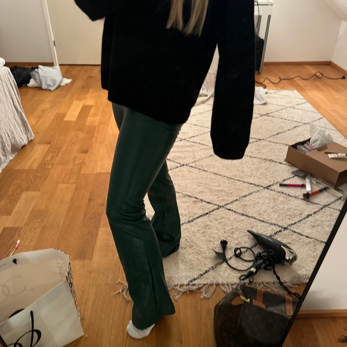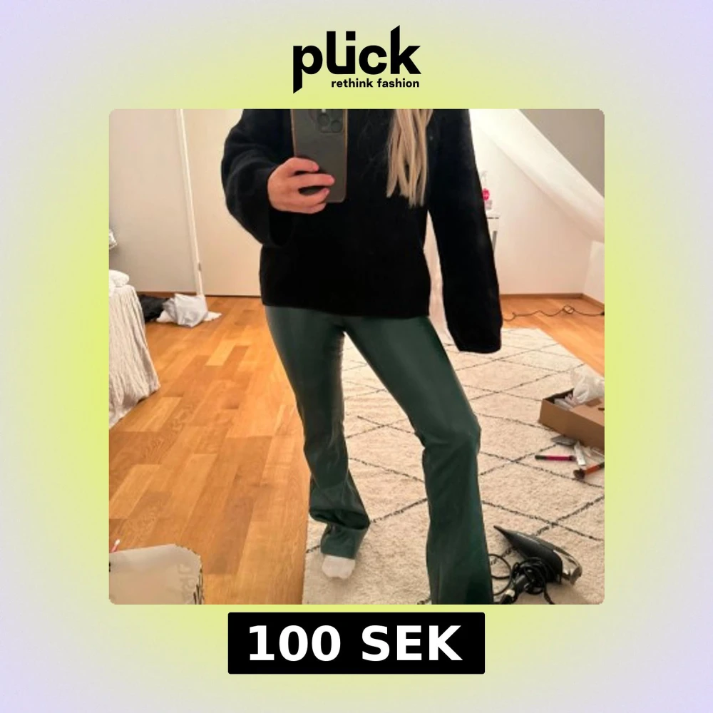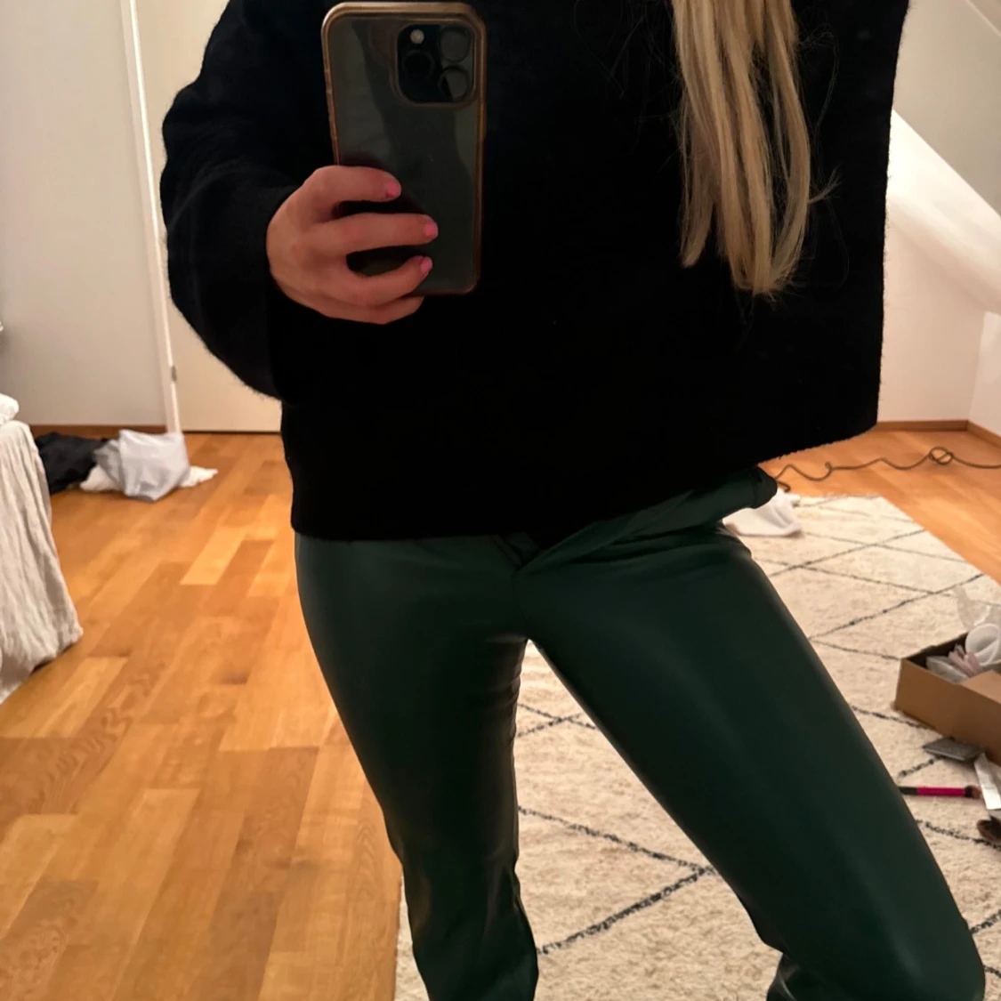 Snygga gröna byxor i syntetmaterial med en glansig finish. De har en tight passform och är perfekta för en trendig look. Byxorna är midwaist och har en rak stil som ger en modern touch. Dragkedja sönder men knapp funkar.