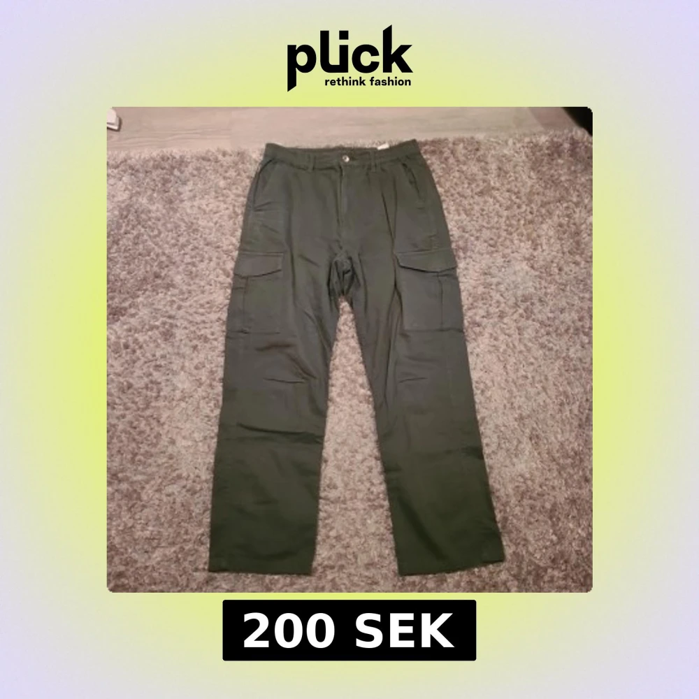 Avslappnad passform, mörkgrön färg, praktiska fickor och raka i formen