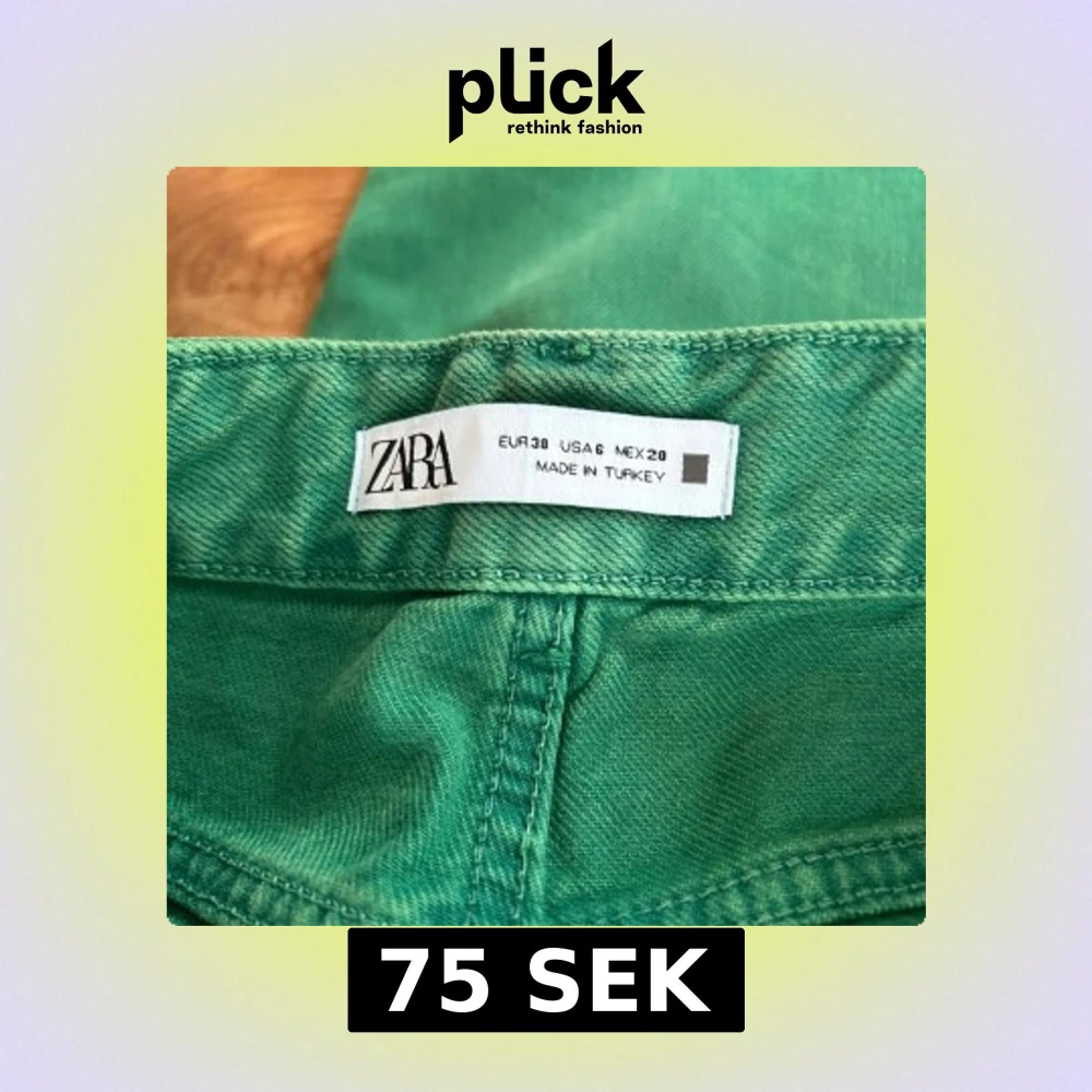 Snygga gröna jeansbyxor från Zara i klassisk femficksmodell. Byxorna har hög midja och raka ben, tillverkade i bomull med en skön känsla. Perfekta för dig som vill sticka ut med färg i vardagen.