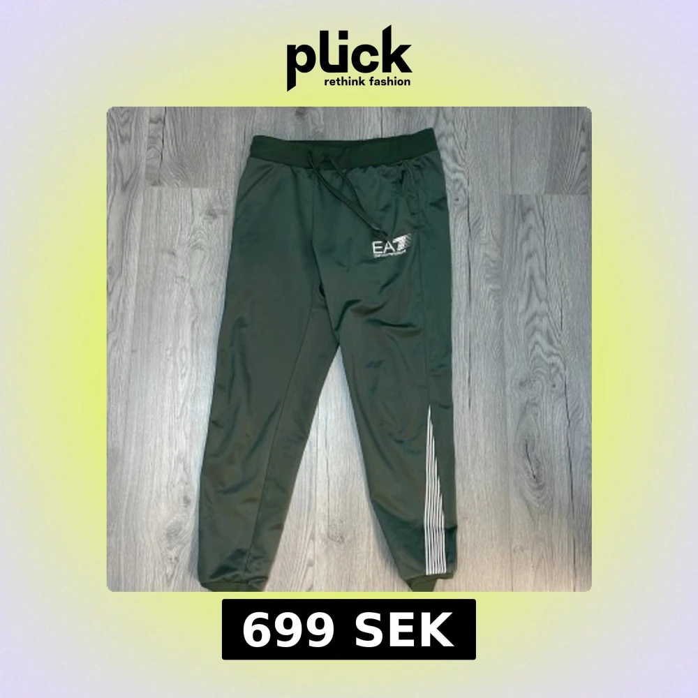 Snygga gröna träningsbyxor från Emporio Armani med EA7-logga på sidan. Byxorna har en elastisk midja med snörning och vita ränder längs ena benet. Perfekta för en sportig look.