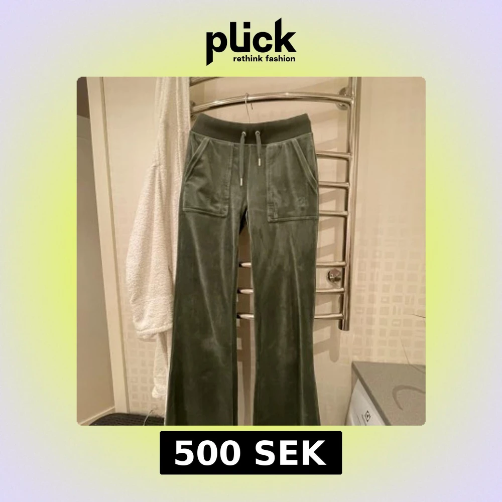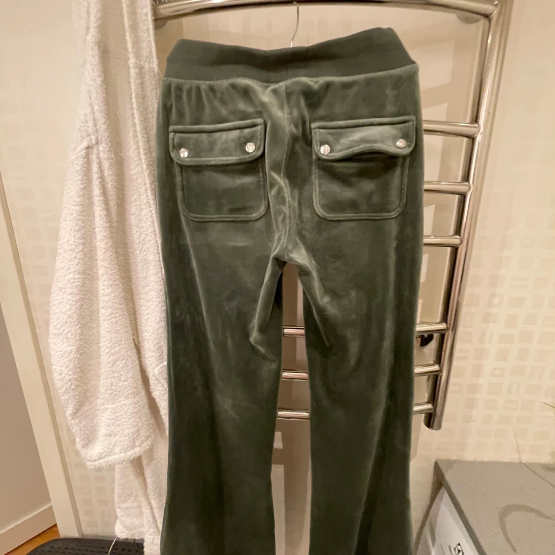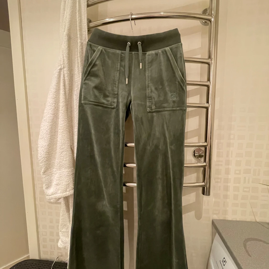 Snygga gröna mjukisbyxor från Juicy Couture med breda ben och snörning i midjan. Byxorna har praktiska fickor både fram och bak med knappar. Perfekta för en avslappnad stil. Köpa för 1200kr
