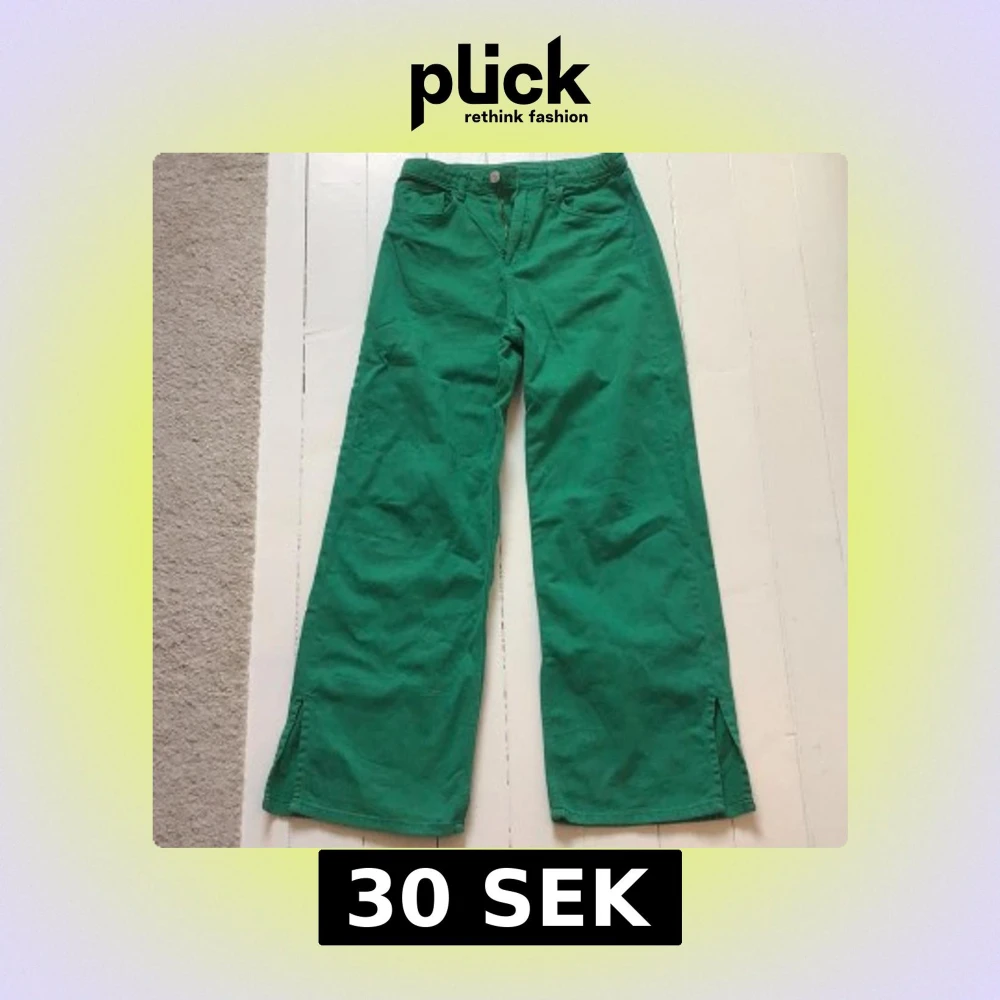 Snygga gröna byxor med vida ben och slitsdetaljer vid fållen. Byxorna har en hög midja och stängs med knapp och dragkedja. Perfekta för en färgglad look! Bara använda några gånger.