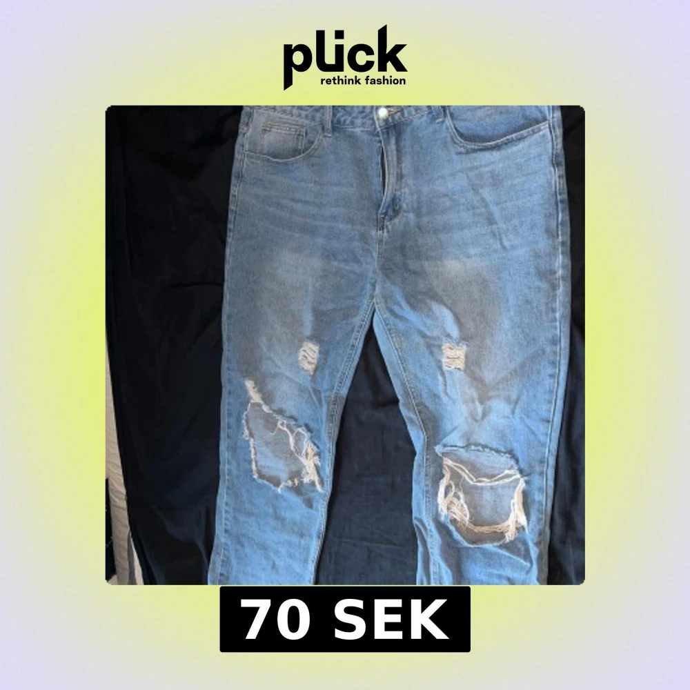 Säljer ett par ljusblå jeans med stora slitningar och hål på båda benen, raka ben och normal passform. Perfekta för en avslappnad streetstil och tillverkade i bomullsdenim.