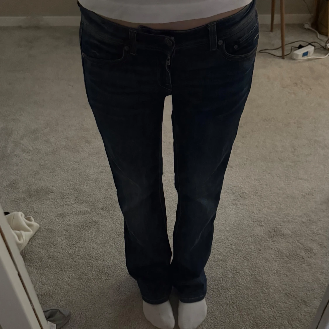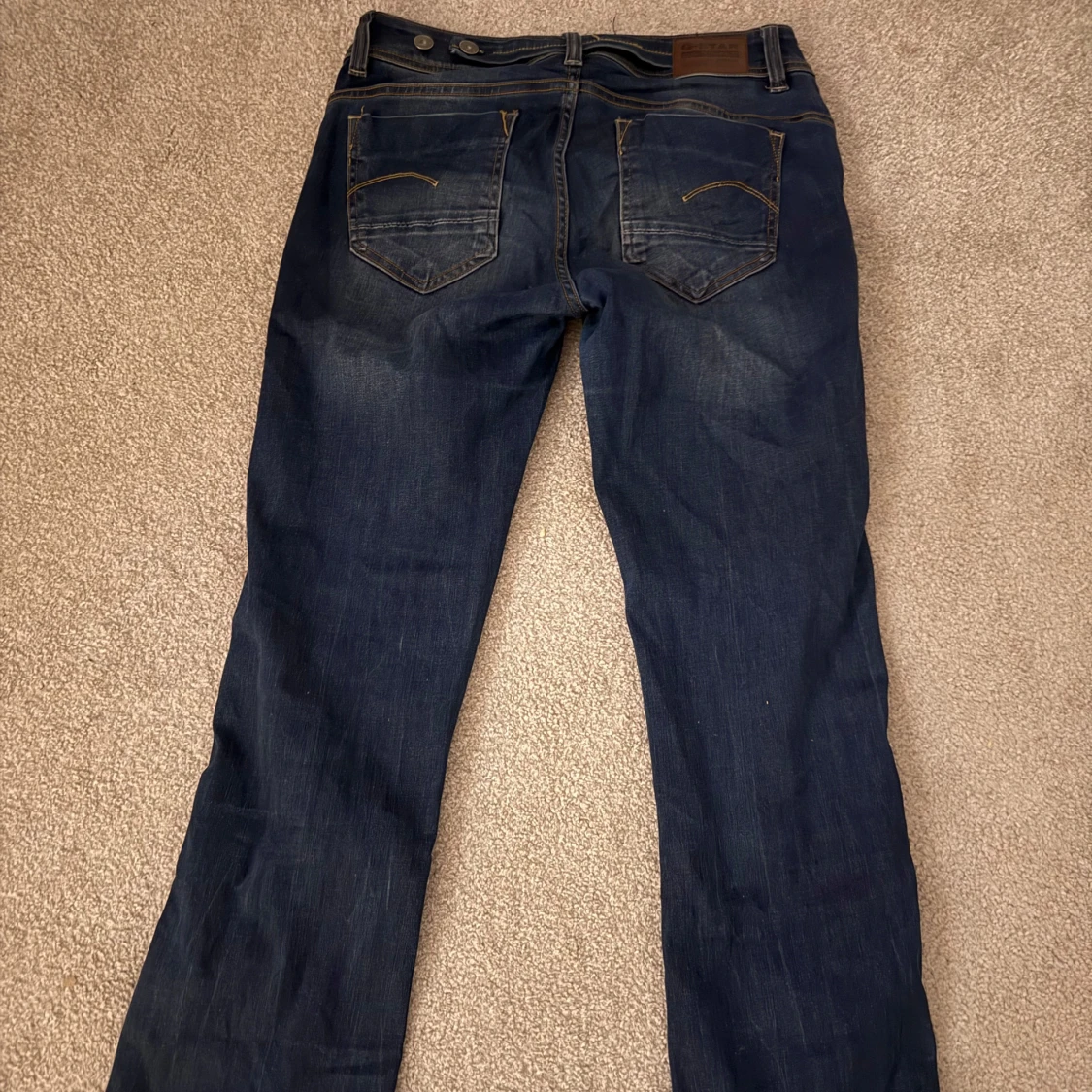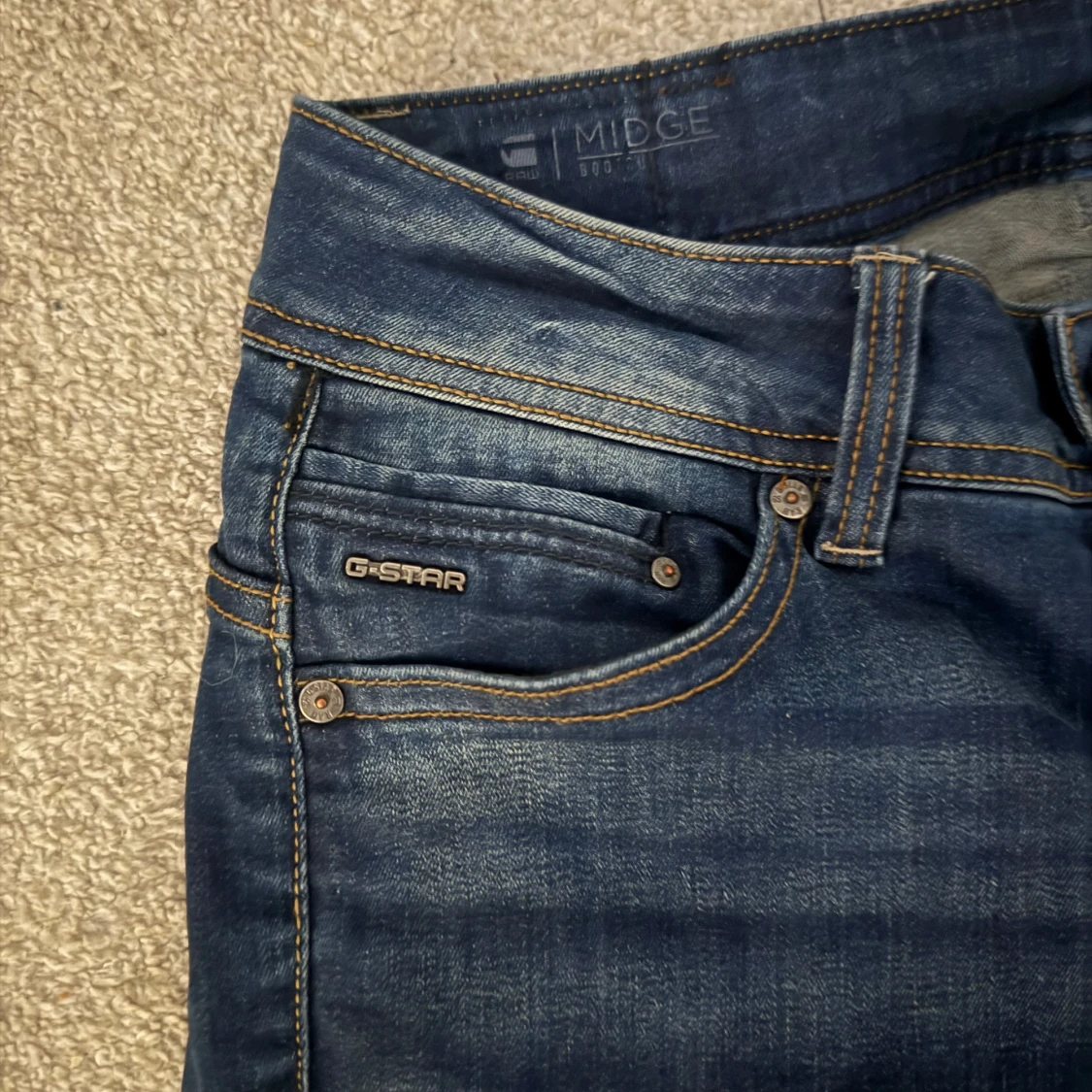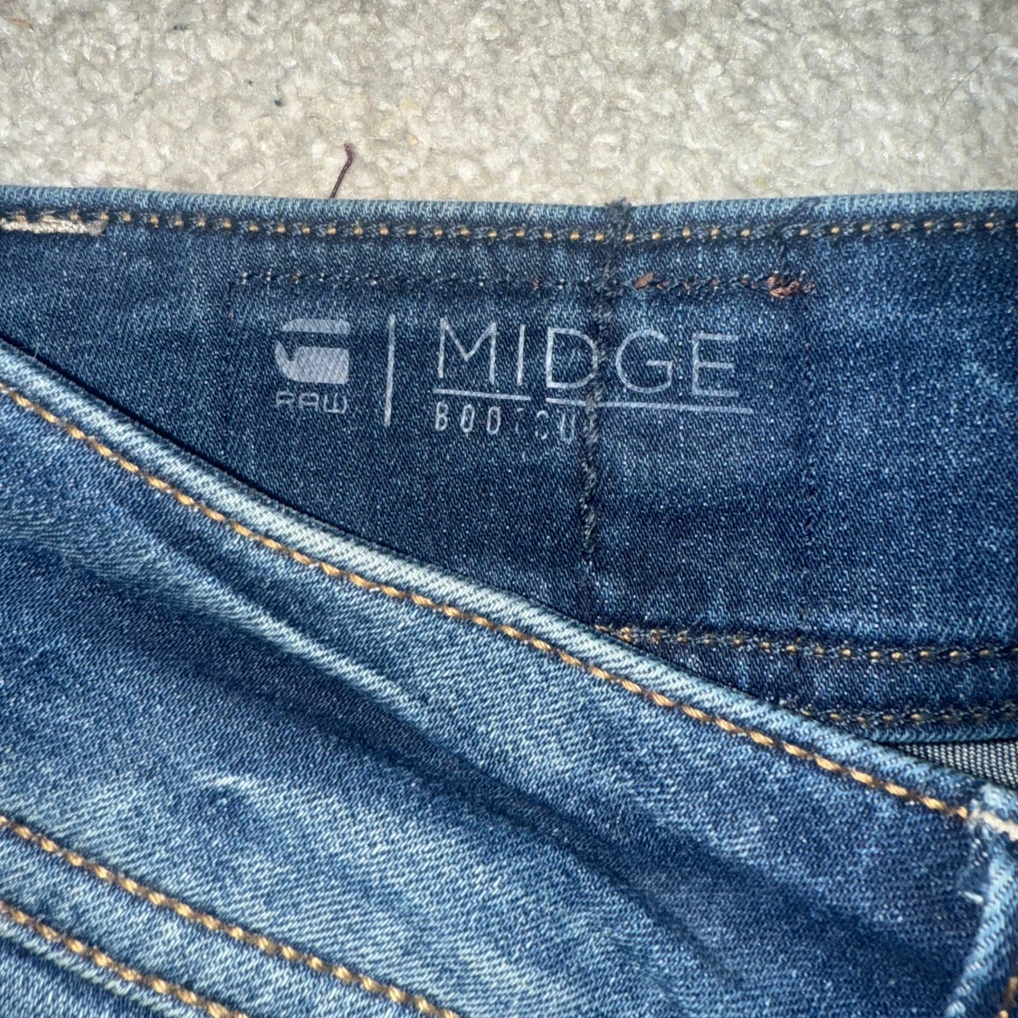 Snygga mörkblå bootcut jeans från G-Star RAW, modell Midge. Klassisk femficksdesign med G-Star-logga på myntfickan och kontrastsömmar. Jeansen är i stretchigt denim och har en normal passform med bootcut-ben. Perfekta till sneakers eller boots. Det är längd 34 men dom är upplagda till längd 32. Köpte dom för 1200.