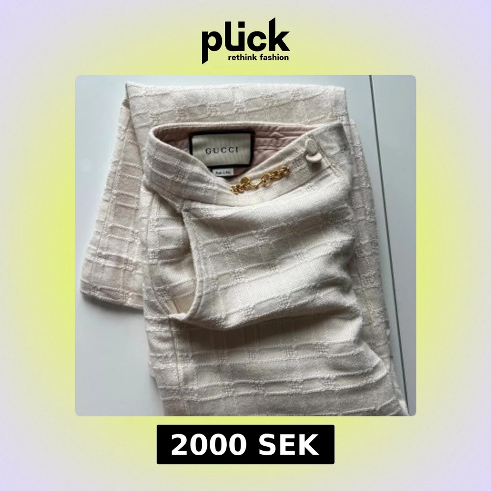 Vita vintage kostymbyxor från Gucci med rutigt strukturmönster och snygg guldfärgad kedjedetalj i midjan. Byxorna har rak passform, hög midja. Lite stora för mig men passar min mamma som har storlek S/M!