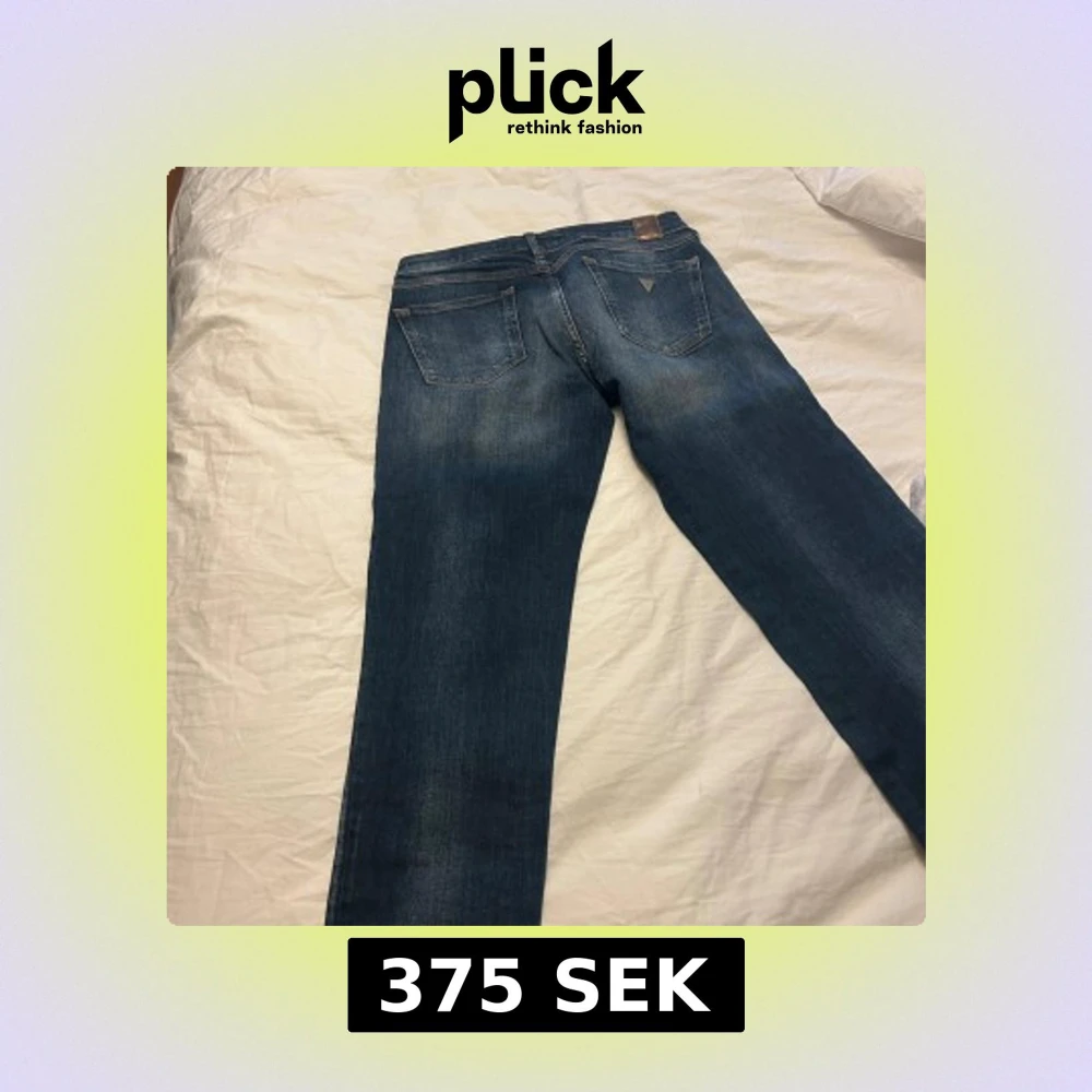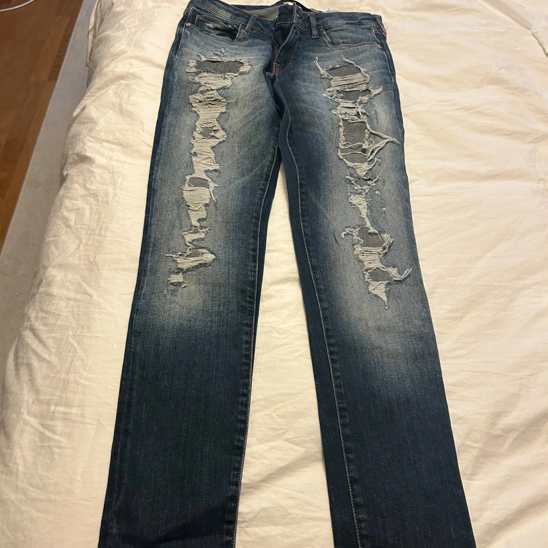 Säljer ett par blå skinny jeans från Guess med rejält slitna detaljer framtill. Jeansen har klassisk femficksdesign, normalhög midja och är tillverkade i jeansmaterial. Perfekta för dig som gillar en edgy och trendig look.