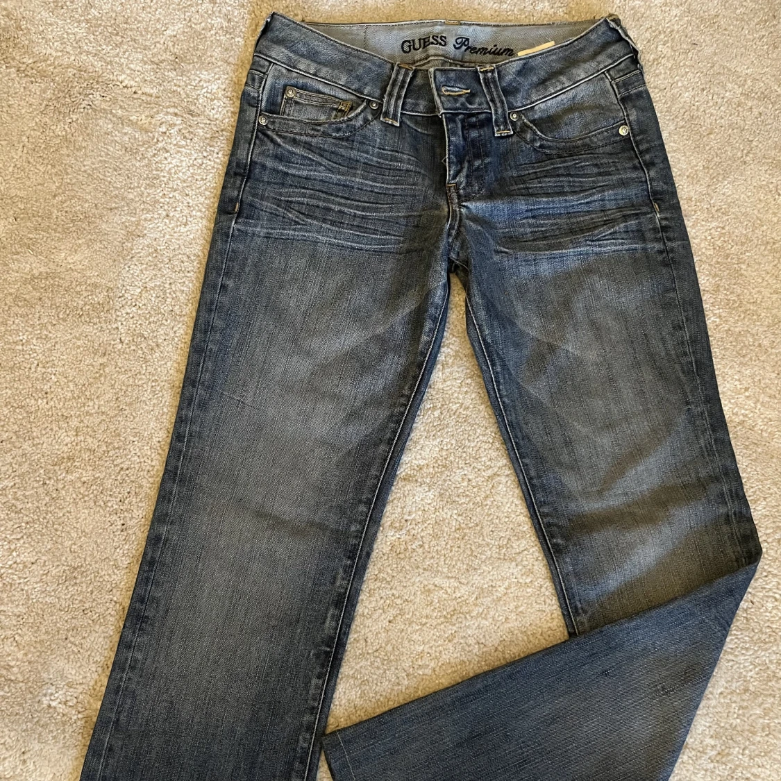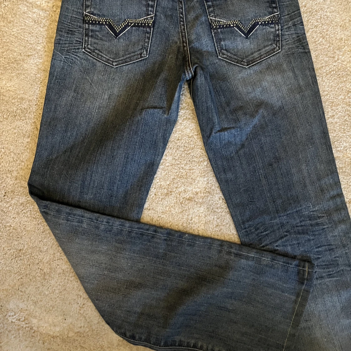 Lågmidjade jeans med raka lätt utsvängda ben. Passar som storlek S i en urtvättad blå färg! Jättefina bakfickor och glitterdetaljer. 39 cm tvärs över midjemått när de ligger platt. Passar i längd på mig som är runt 165. KÖP DIREKT FÖR 400 kr eller buda💓