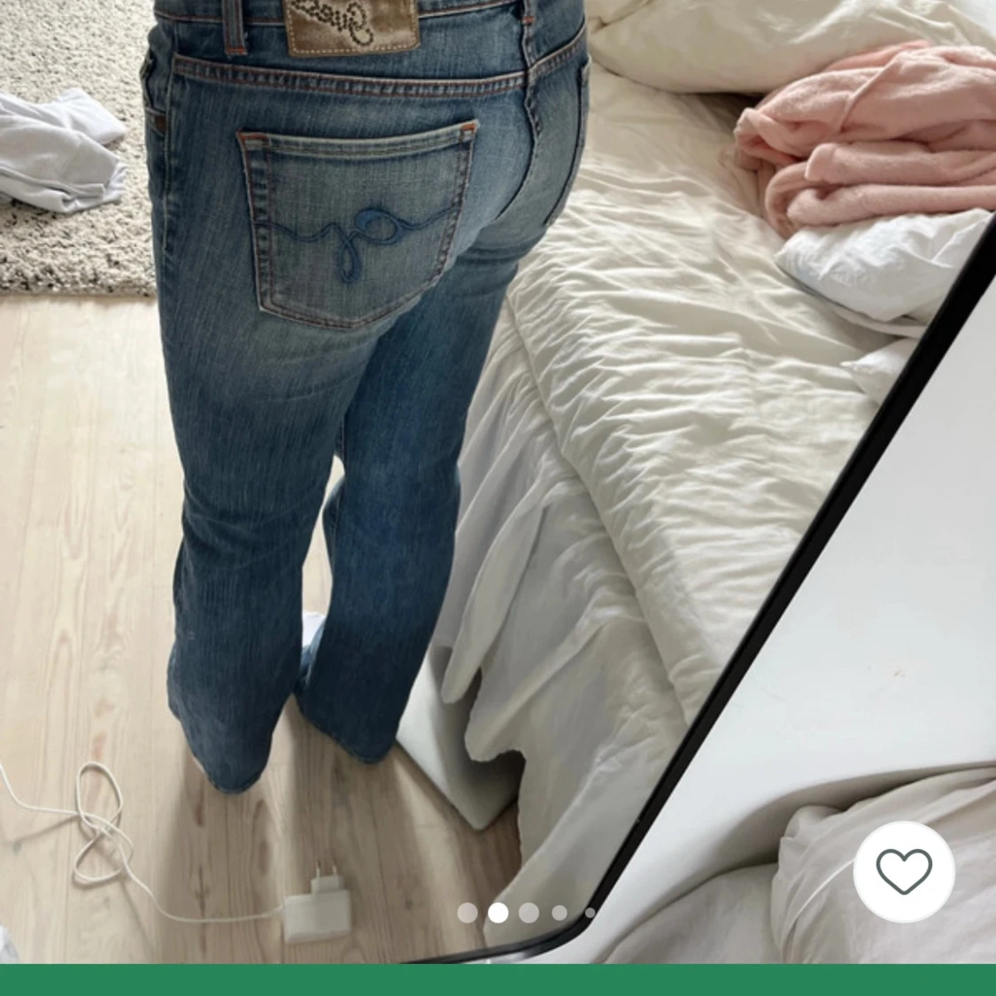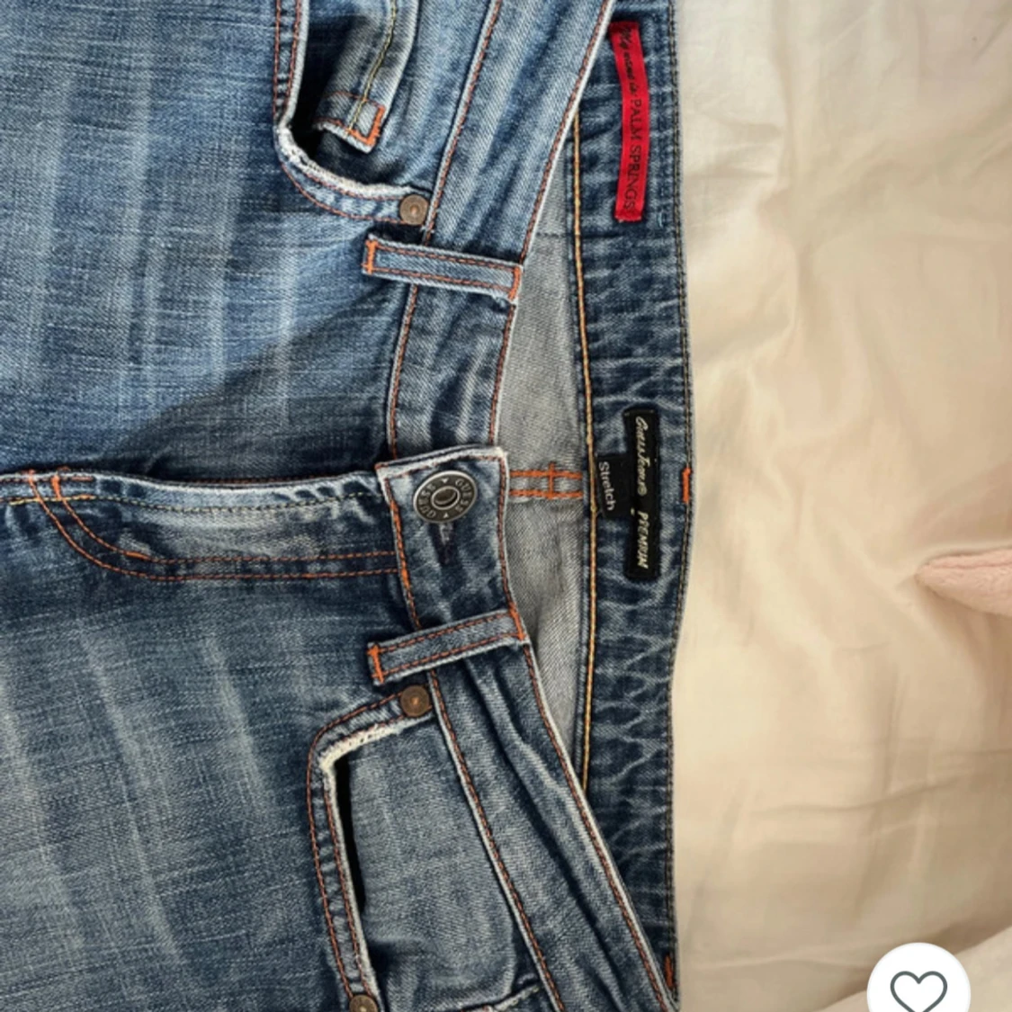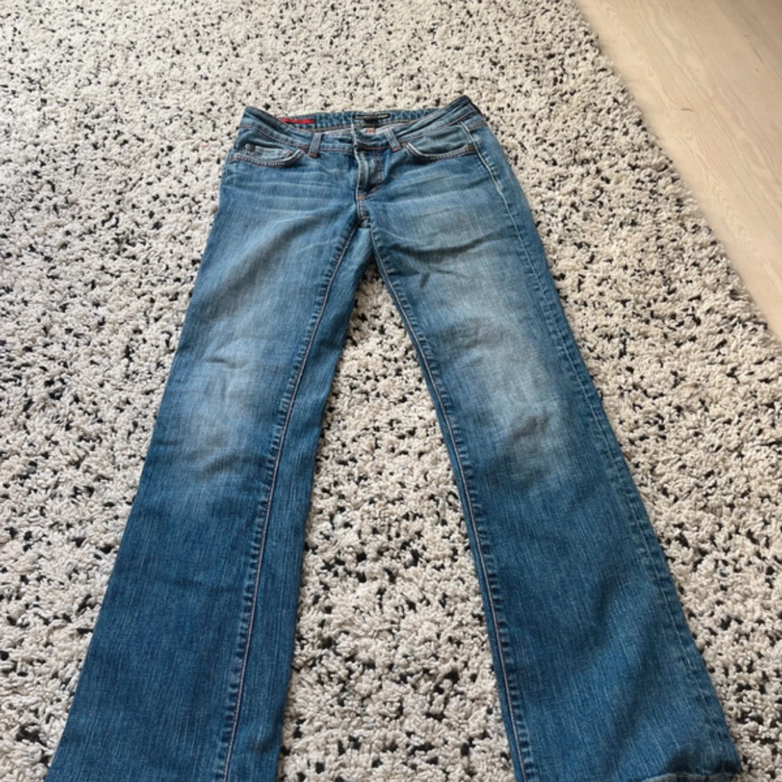 Snygga blå jeans från Guess med bootcut passform och låg midja. Jeansen har klassiska fem fickor, orangea kontrastsömmar och broderad detalj på bakfickan. Tillverkade i stretchig denim för extra komfort. Köpte de på Vinted och har gammal ägares bilder pga av att de inte passar mig💕pris kan diskuteras