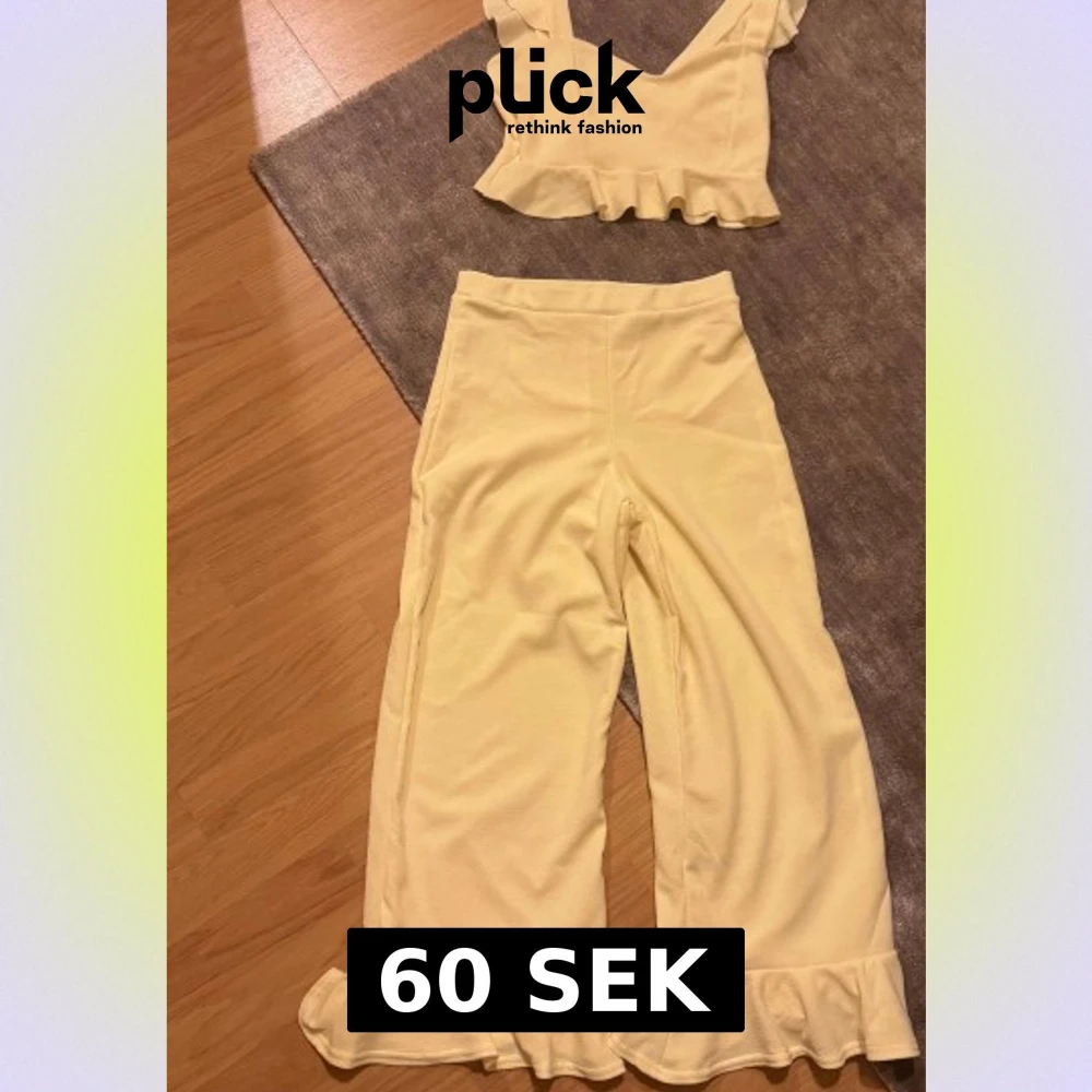Säljer en ljusgul byxdress med breda ben och volangdetaljer vid benslut. Byxdressen har en mjuk och lätt struktur, perfekt för sommarens varma dagar. Materialet känns som bomull eller syntet och färgen är fräsch och glad.