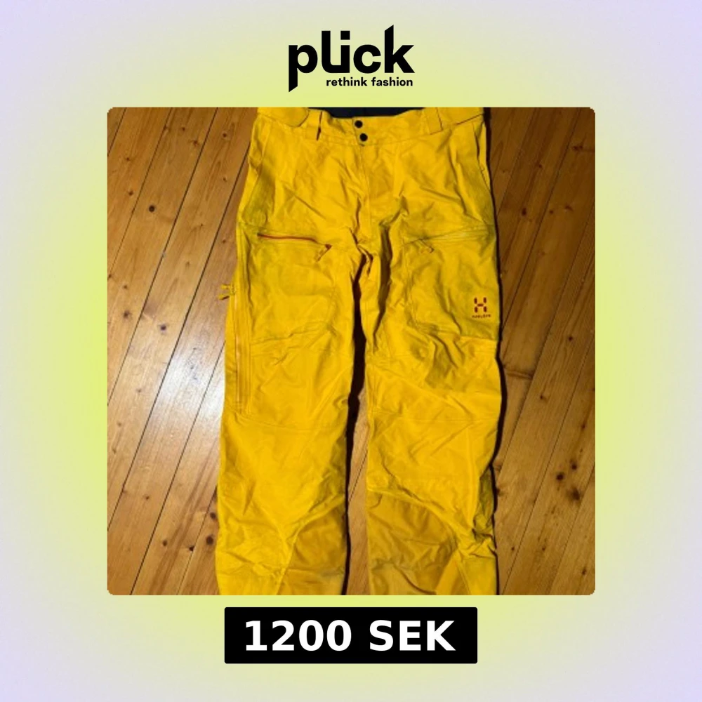 Säljer ett par gula skalbyxor i trelagers GoreTex från Haglöfs, modell ROC/VOJD. Byxorna har praktiska dragkedjor och är tillverkade i ett slitstarkt material, perfekt för utomhusaktiviteter som skid- och Snowboardåkning. Plaggens ljust gula färg har fläckats något av svarta vantar i skinn men det påverkar givetvis inte funktionen.