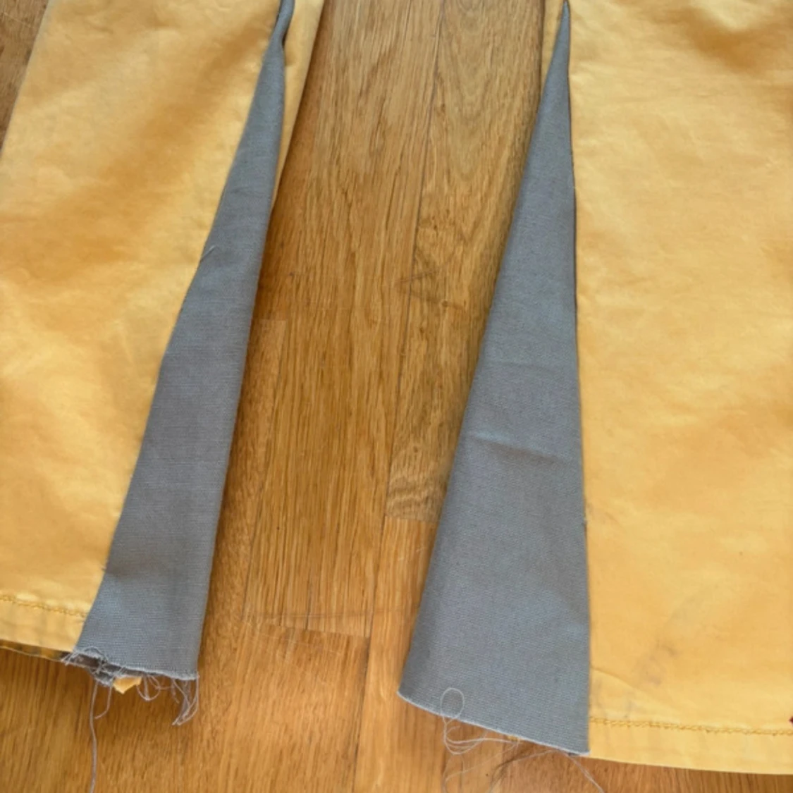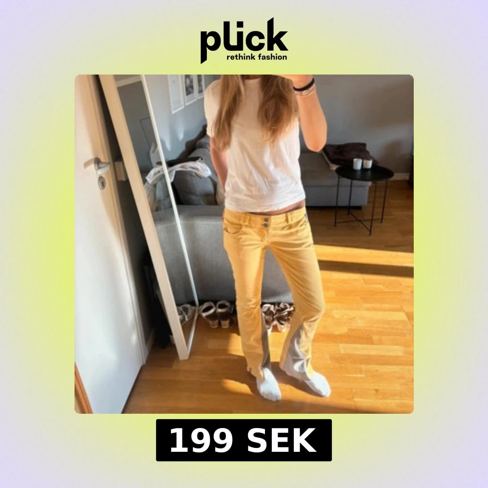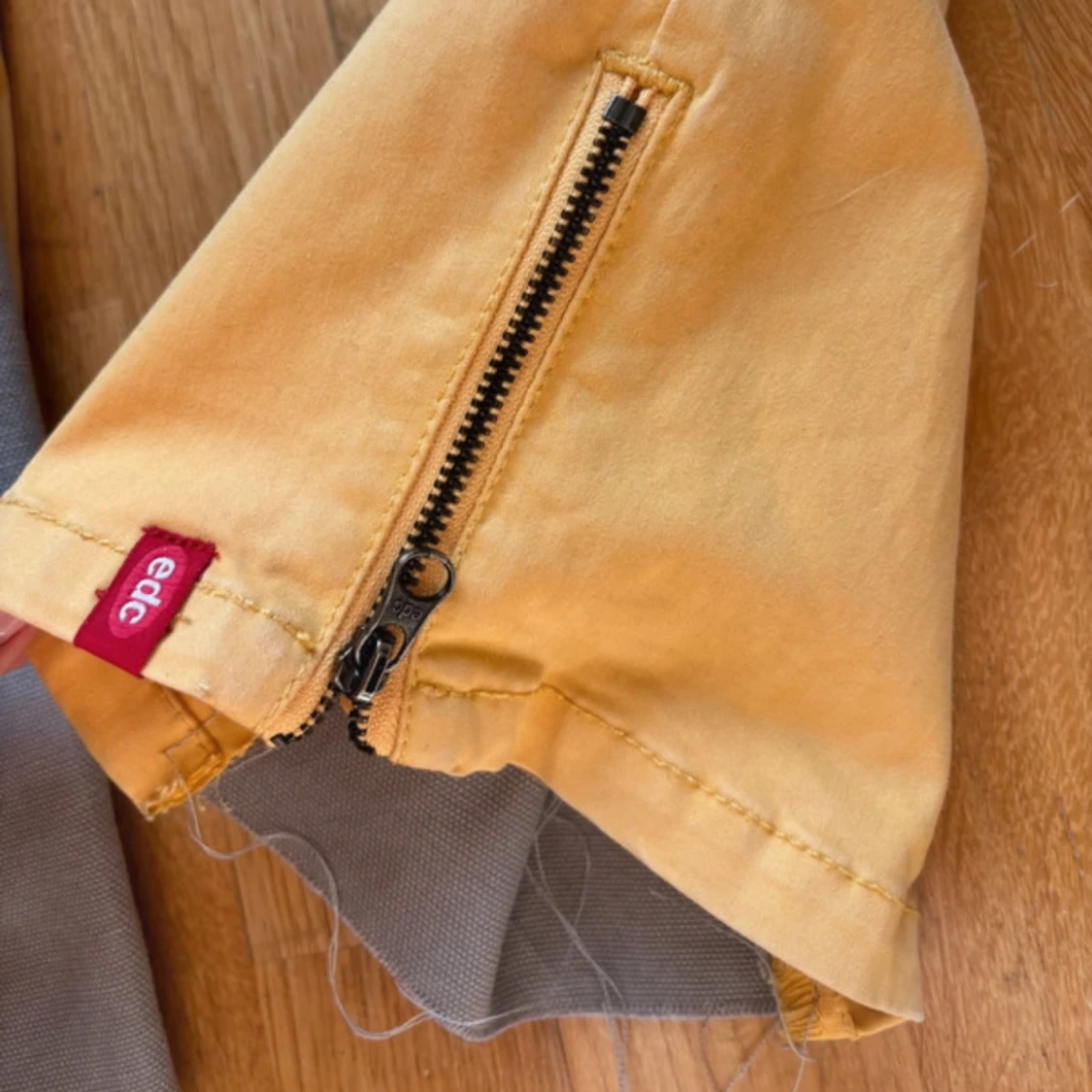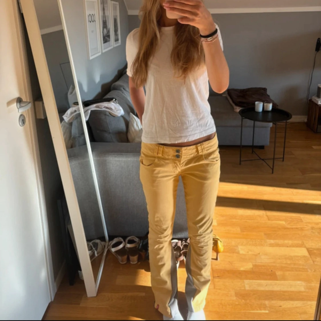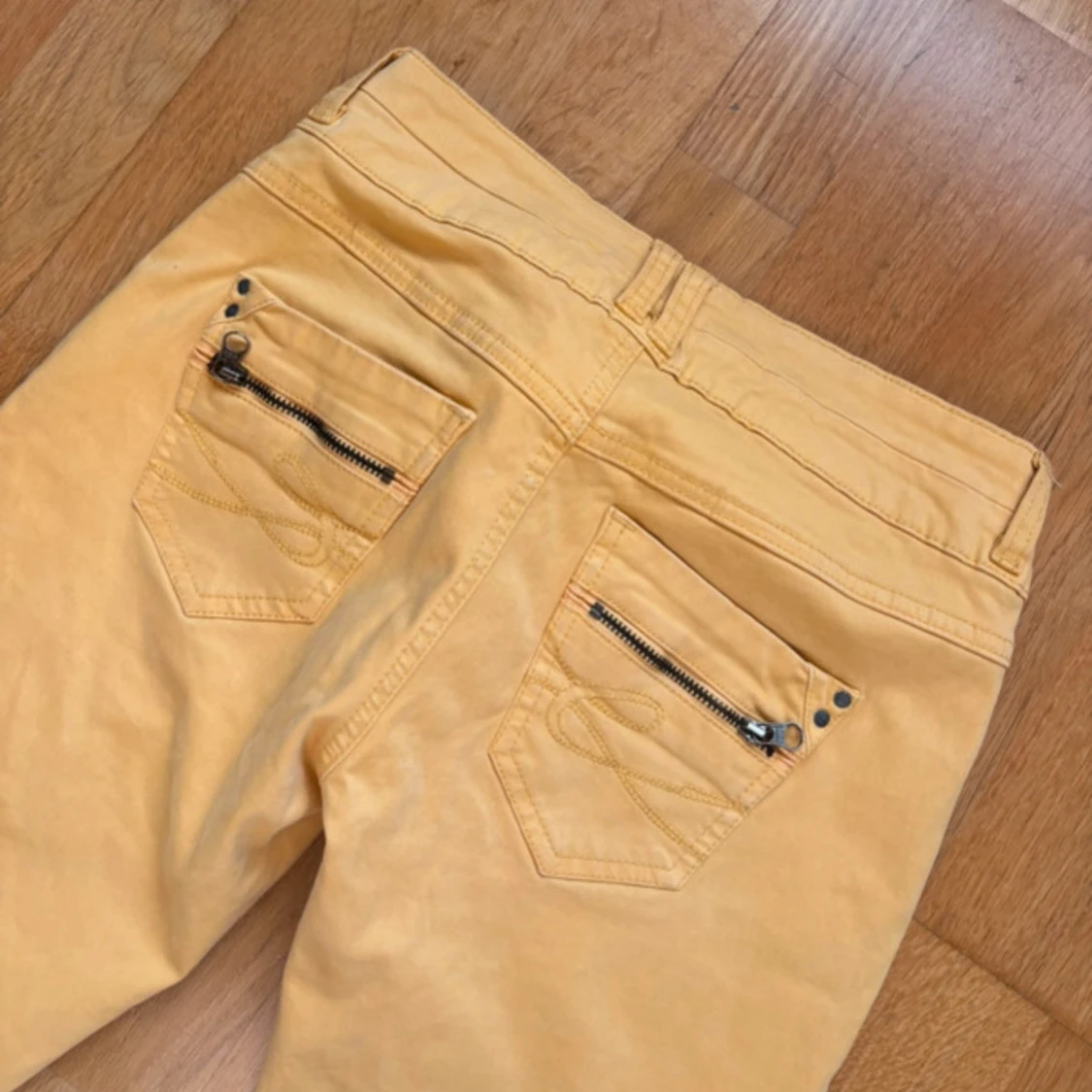 Snygga gula bootcut-byxor med grå insida vid bensluten och råa kanter. Byxorna har låg midja, dekorativa dragkedjor på bakfickorna och dubbla knappar fram. Perfekta för dig som vill sticka ut med färg och coola detaljer.🔥🔥❤️❤️