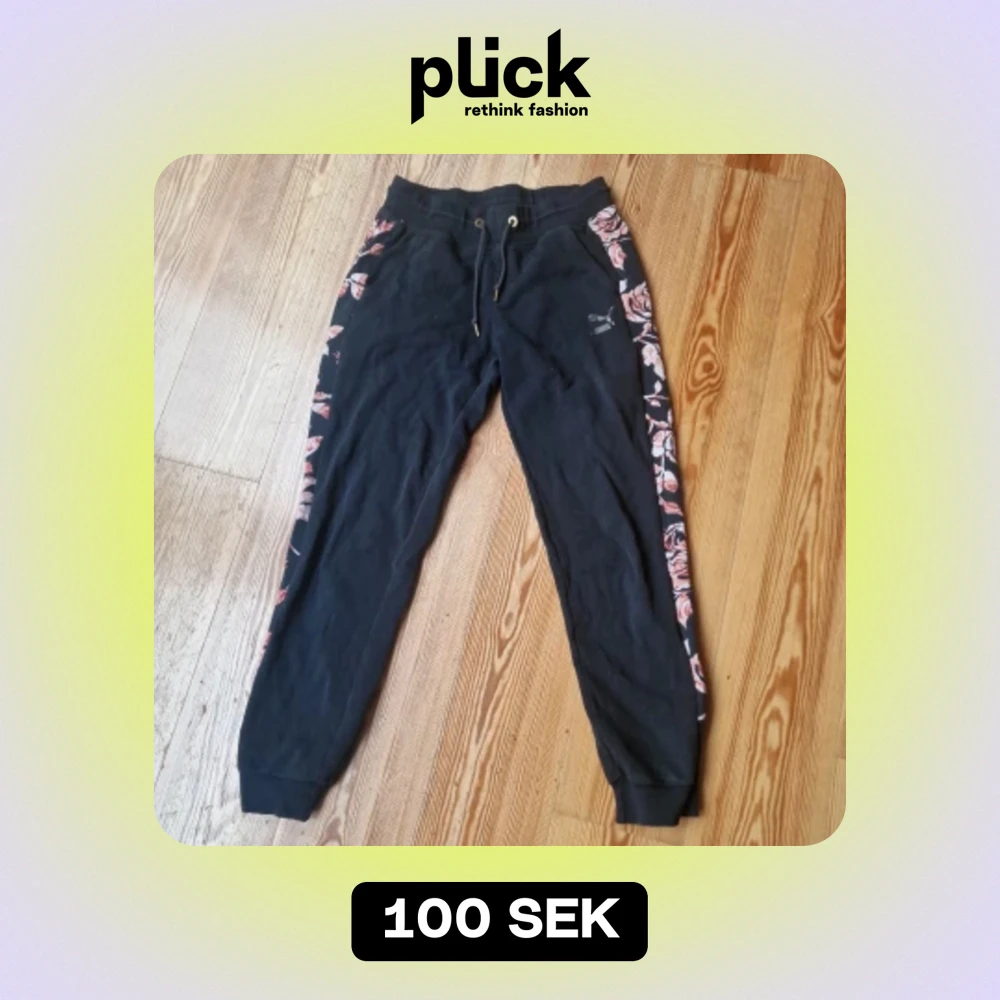 Jättesöta mjukisbyxor från puma Kenza-kollektionen. Köpta för ett tag sedan och har använts men har inga fläckar, hål, eller liknande. Nyskick! Rosmönster på sidorna och gulddetaljer. Storlek M men passar bättre xs/s