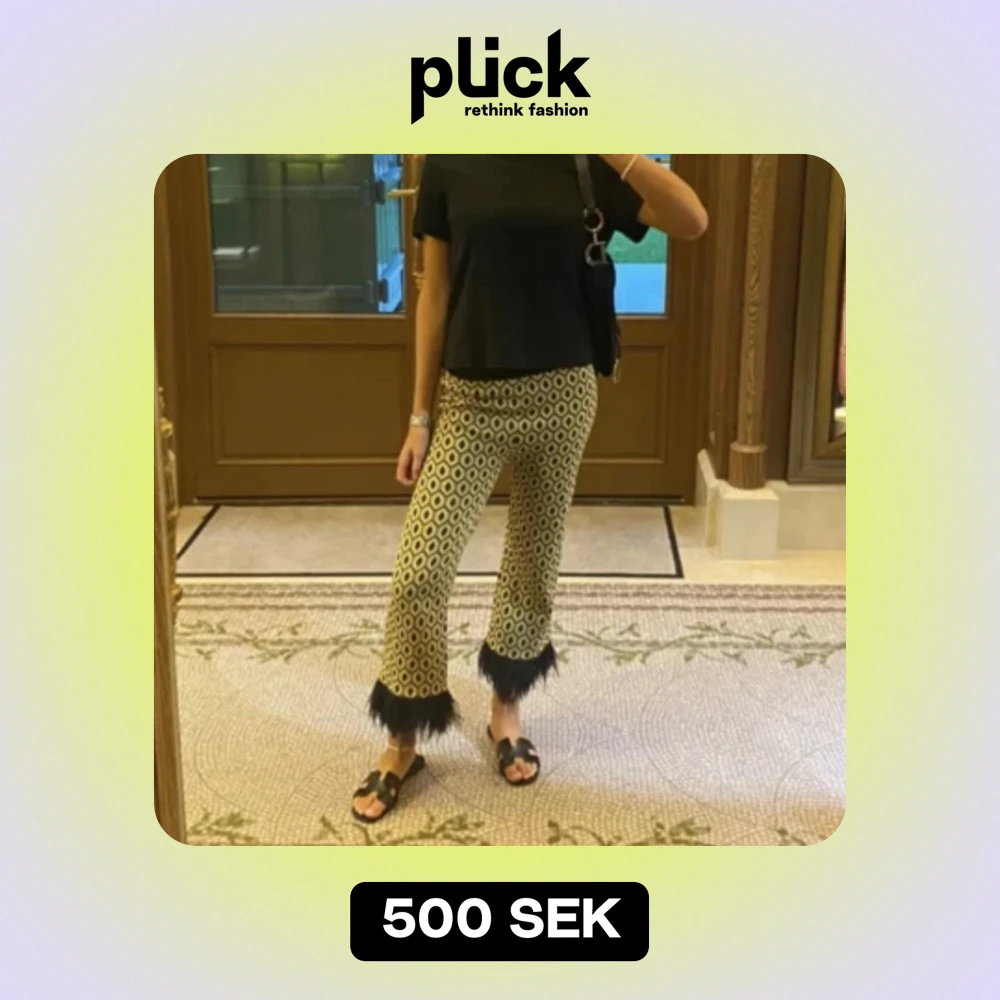Säljer dessa super coola gula mönstrade byxor med fjädrar längst ner! Oanvänt skick❤️
