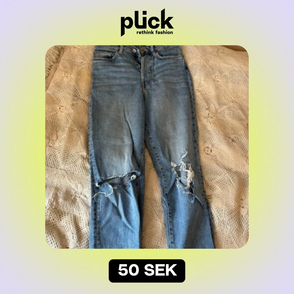 Säljer ett par snygga blå mom jeans från &Denim i storlek S. De är högmidjade och har en cool slitning på knäna som ger en avslappnad look. Perfekta för en casual outfit! 🦋