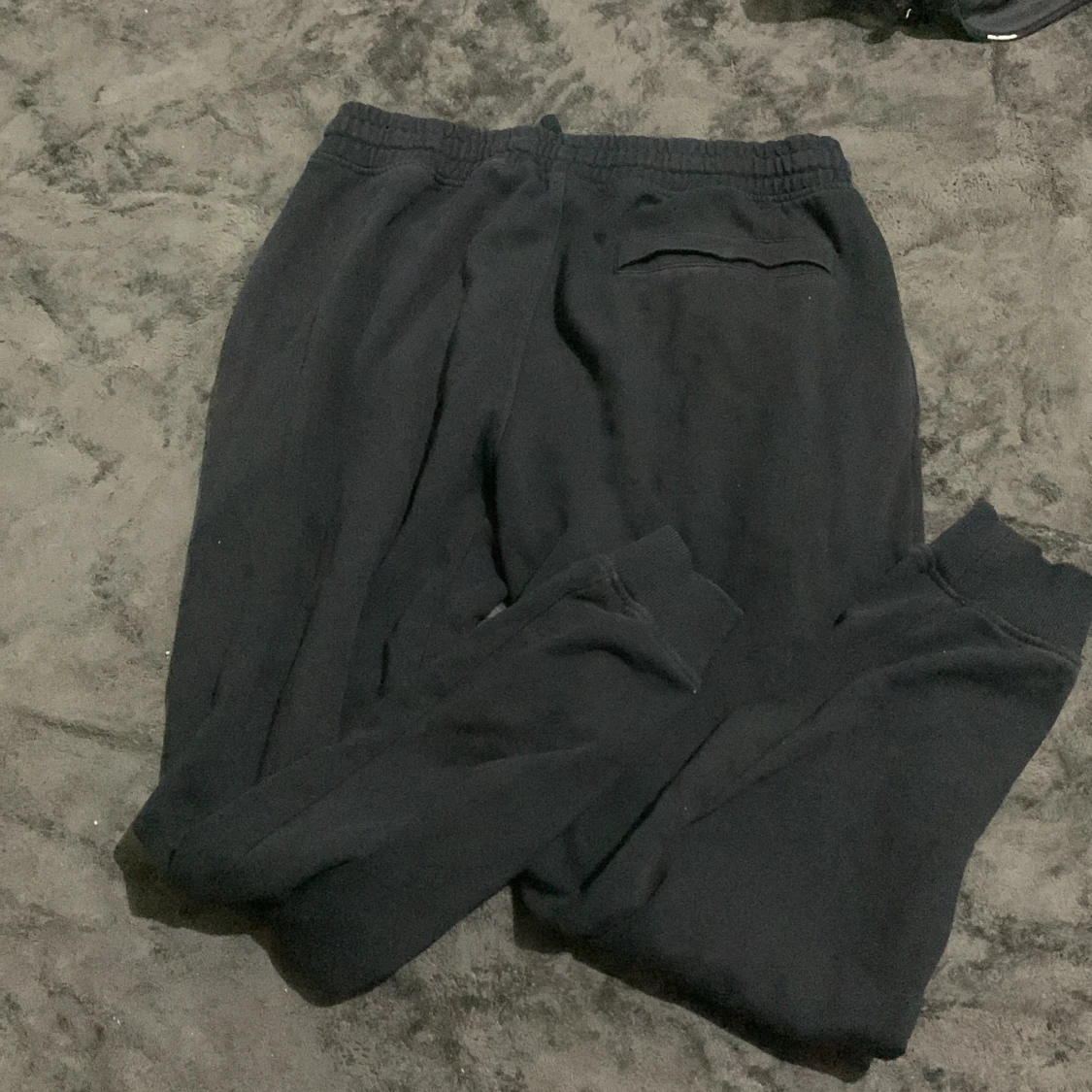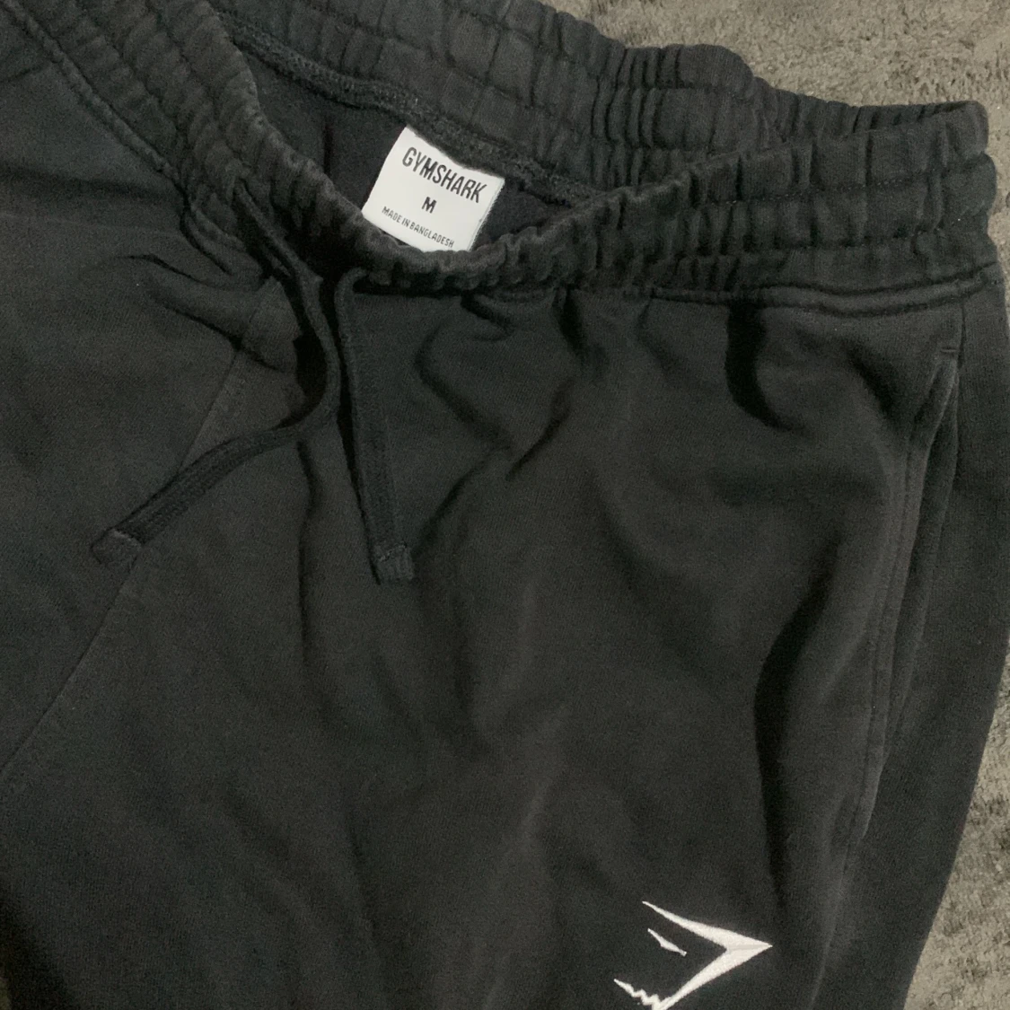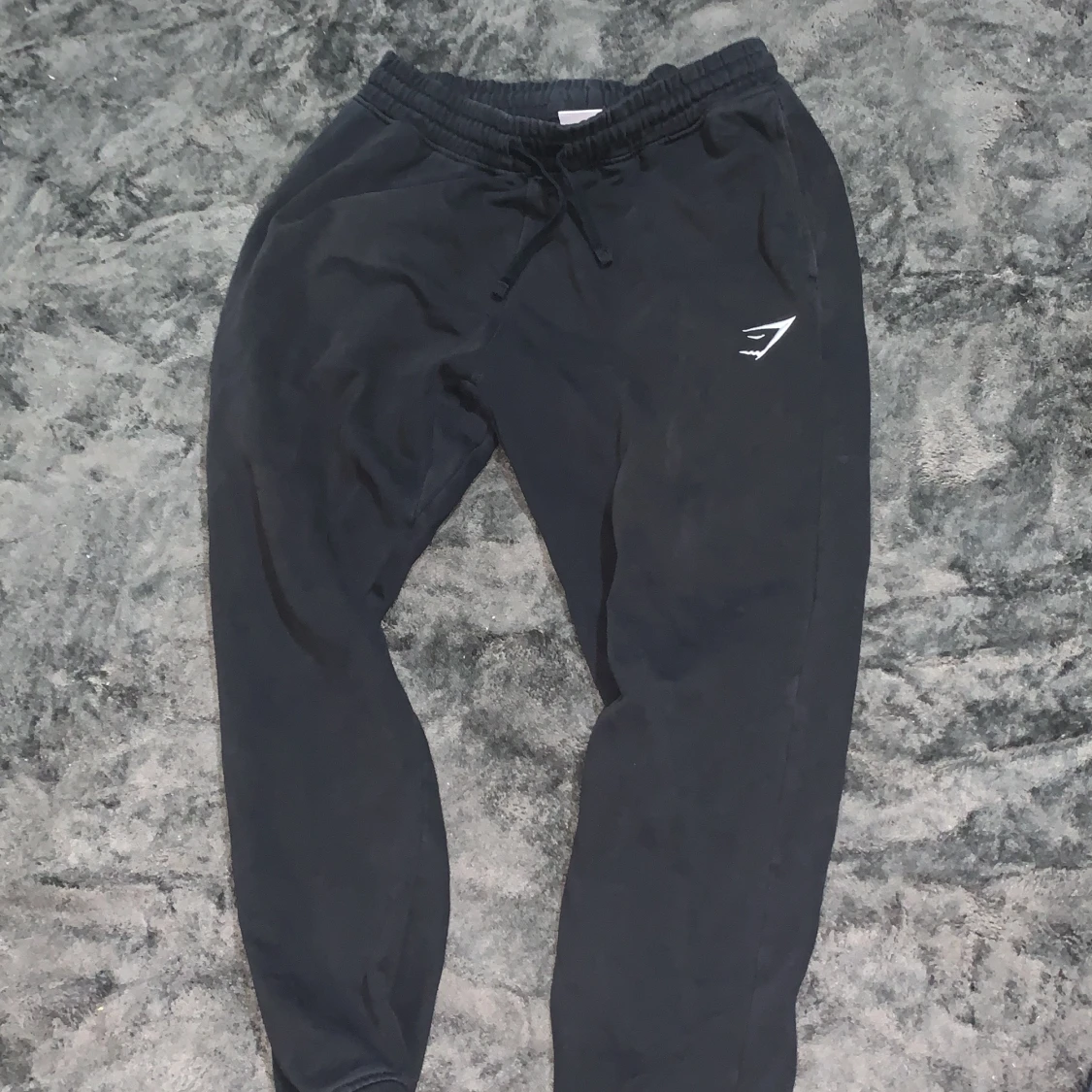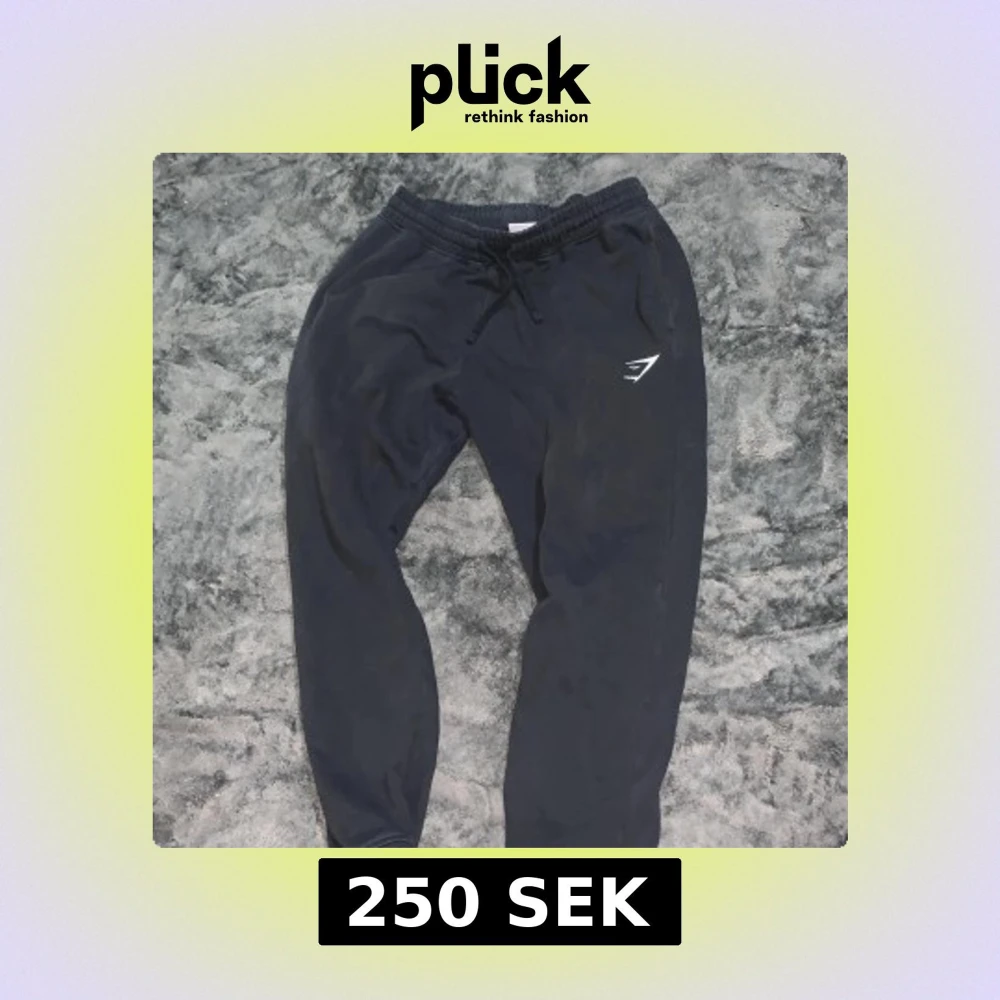 Svarta mjukisbyxor från Gymshark med elastisk midja och snörning. Byxorna har en vit Gymshark-logga på låret, ribbade muddar vid bensluten och fickor både fram och bak. Perfekta för chill eller träning.