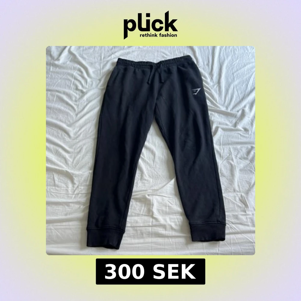 Säljer ett par svarta mjukisbyxor från Gymshark med elastisk midja och snörning. Byxorna har en avslappnad passform och ribbade muddar vid bensluten. Perfekta för en bekväm dag hemma eller på gymmet.