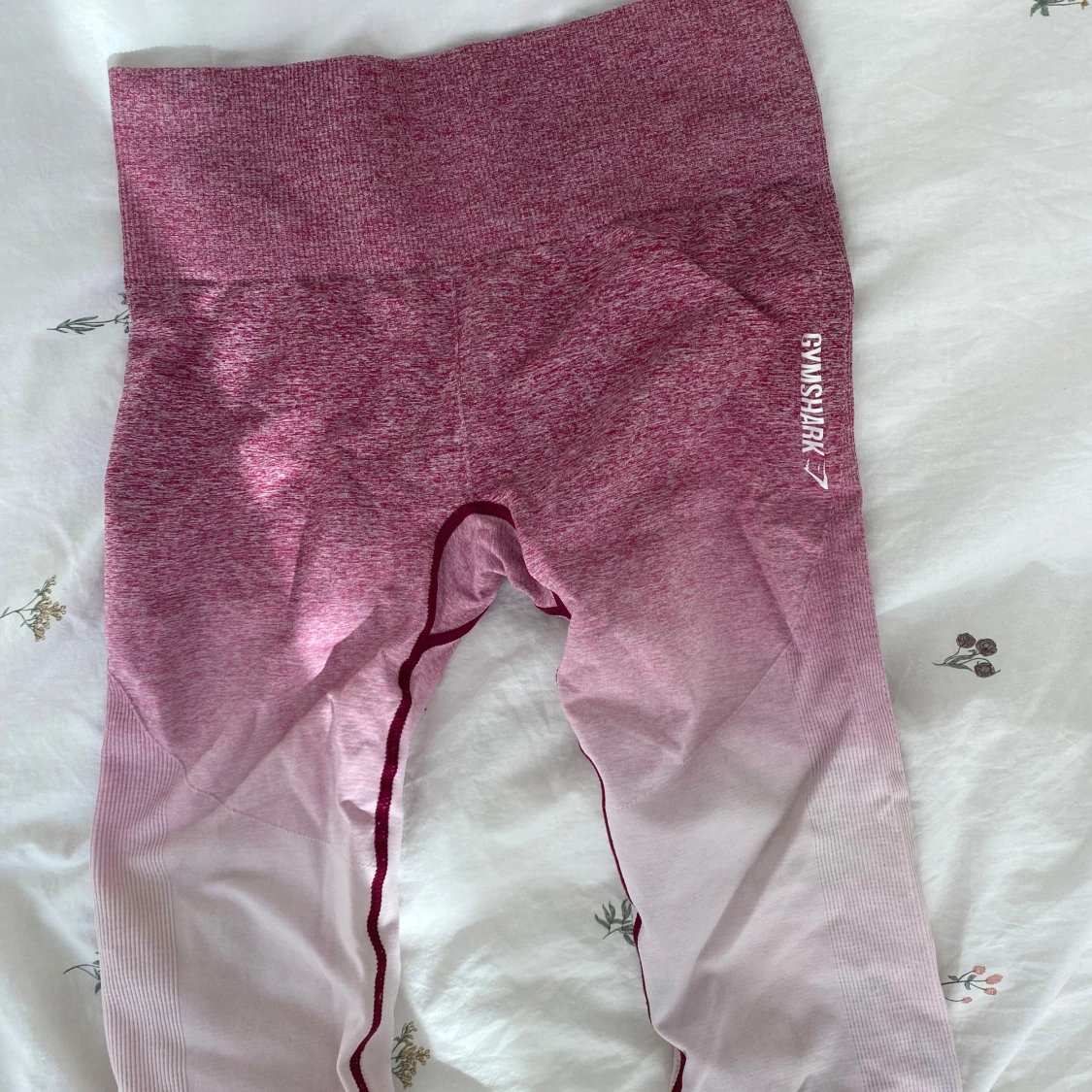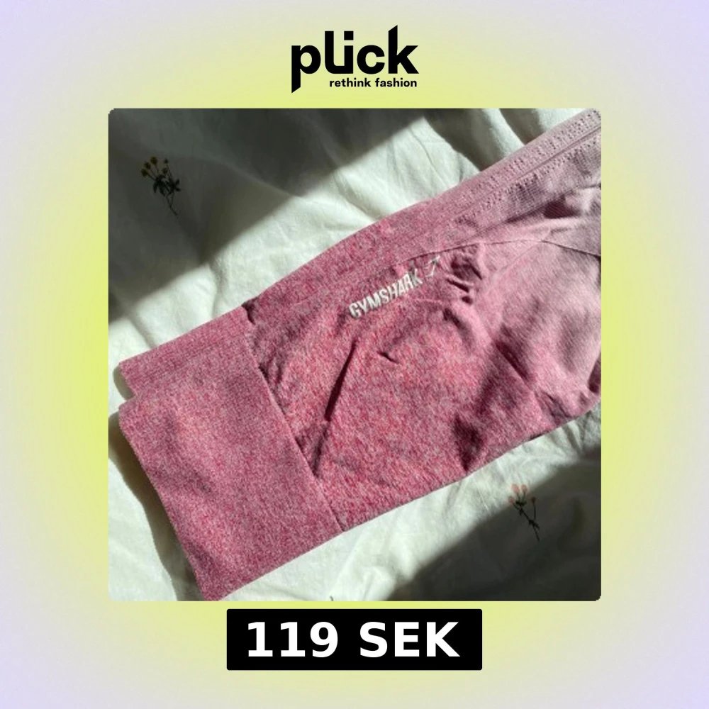 Supersnygga seamless leggings från Gymshark i rosa ombre med hög midja. De är stretchiga och sitter tight, perfekta för gymmet eller annan träning. Materialet är mjukt och följsamt, och loggan syns diskret på låret. Ribbade detaljer längs benen för extra stil.