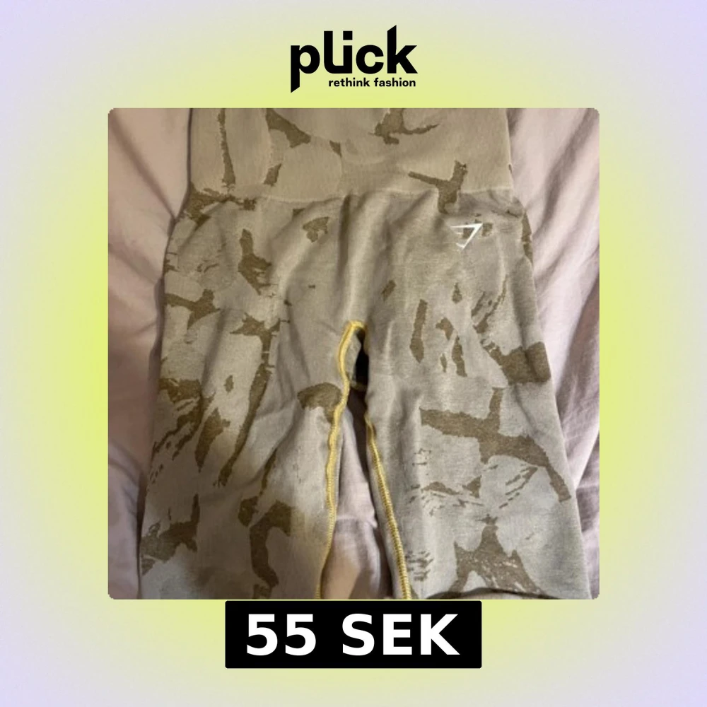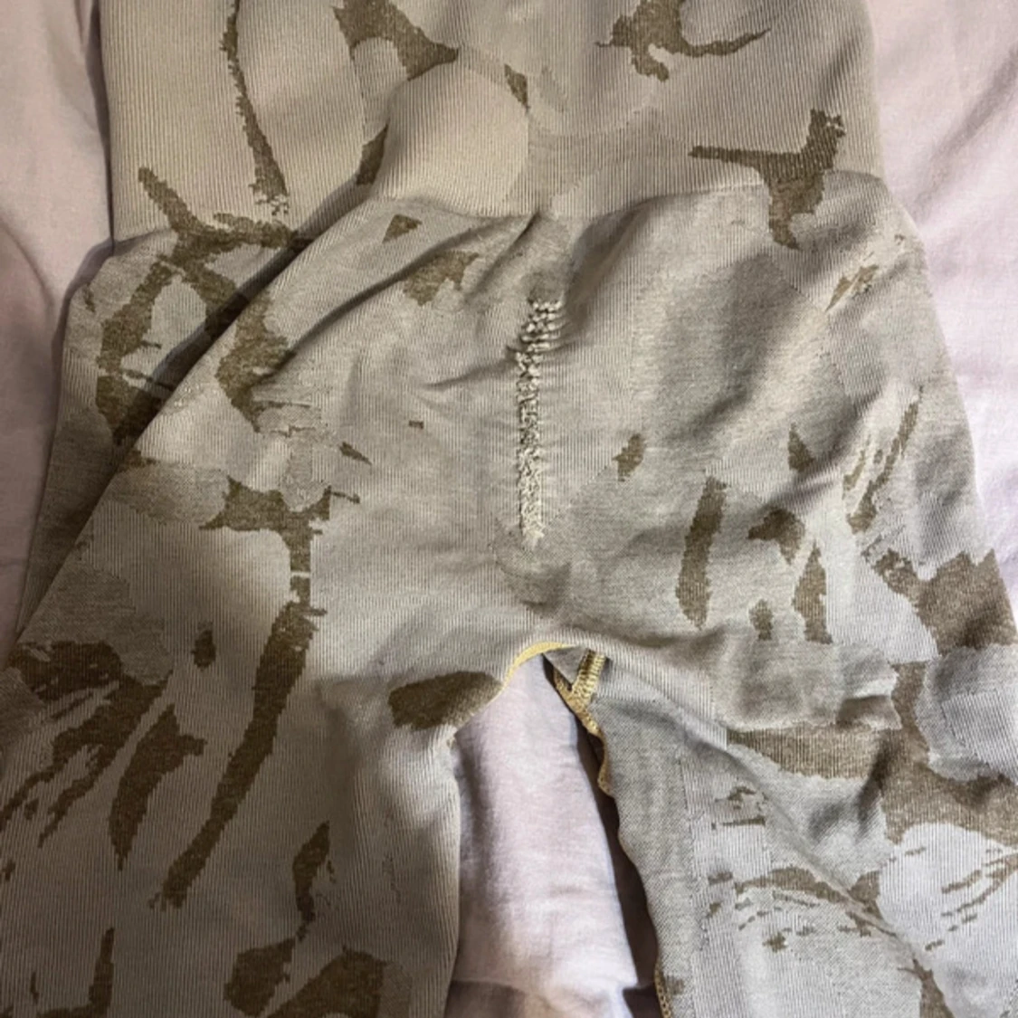 Snygga grå leggings från Gymshark med camouflagemönster och hög midja. De har gul kontrastsöm längs insidan av benen och är tillverkade i ett stretchigt material som passar perfekt för träning. Diskret Gymshark-logga på höften. Sömmen gått av bak