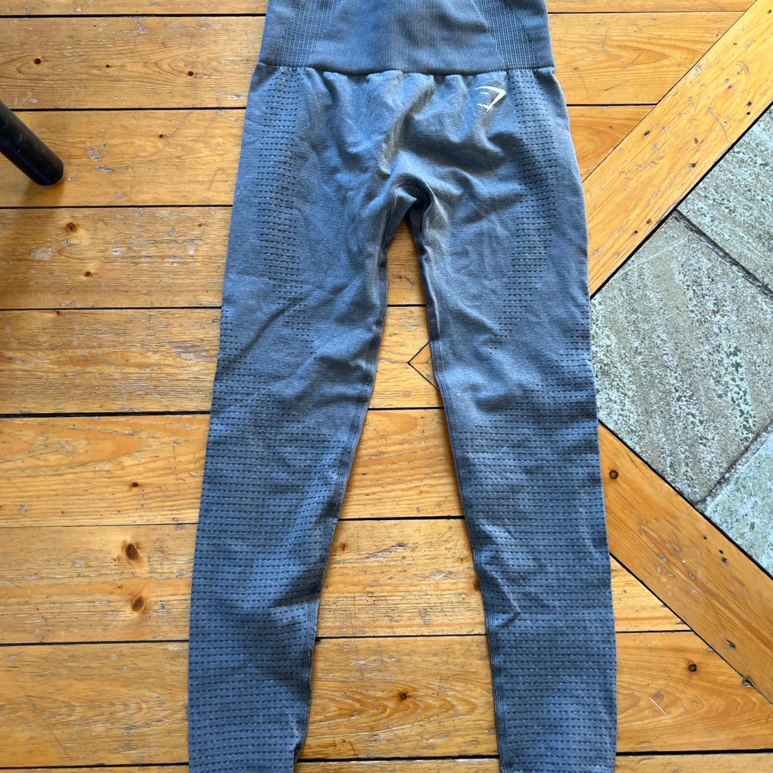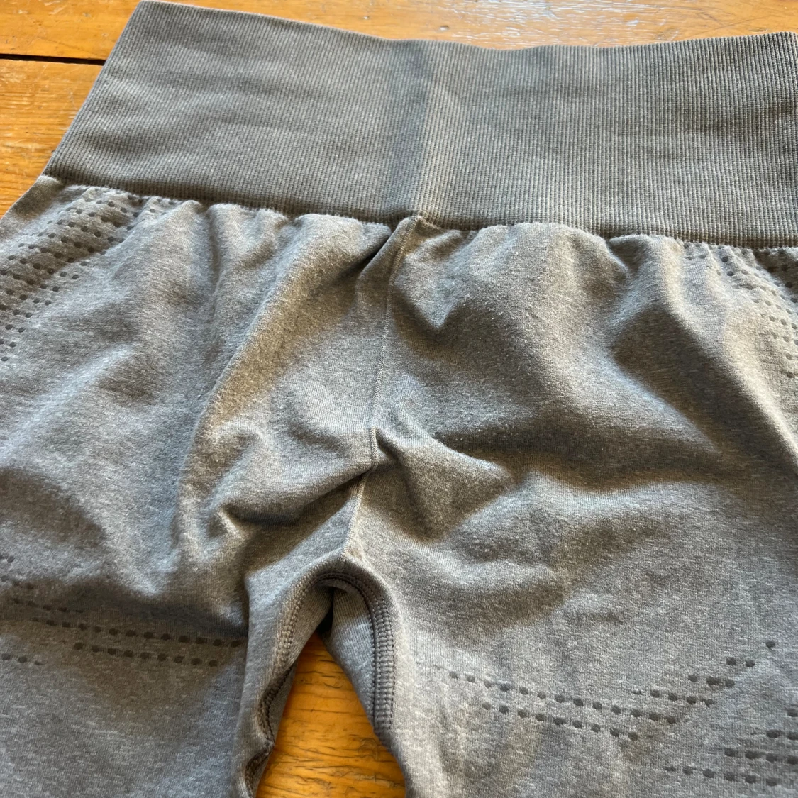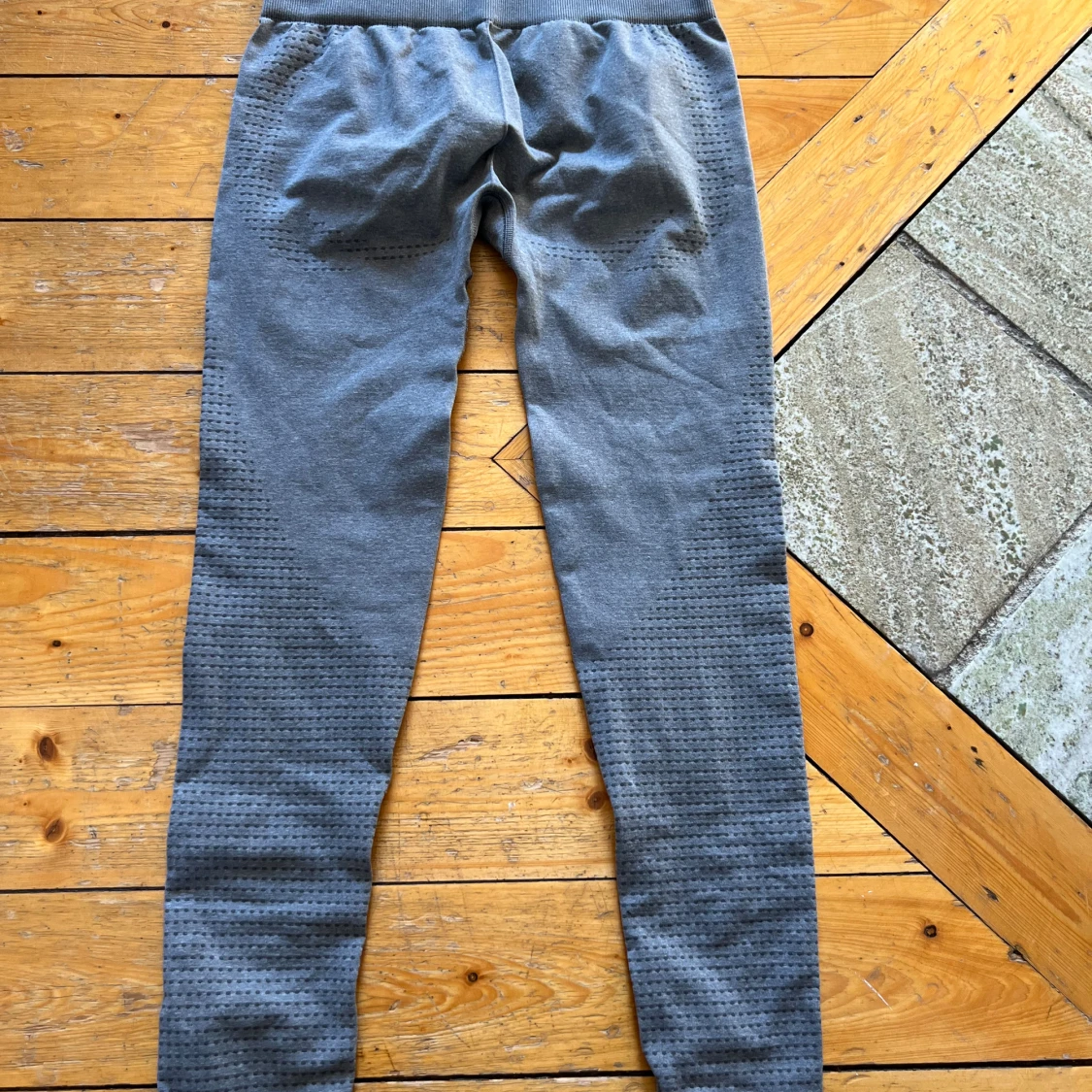 Fina träningstights från Gymshark vital seamless 2.0. Lite noppriga på vissa ställen men känns mer än det syns. Lite sprucket vid märkena men inte mycket.