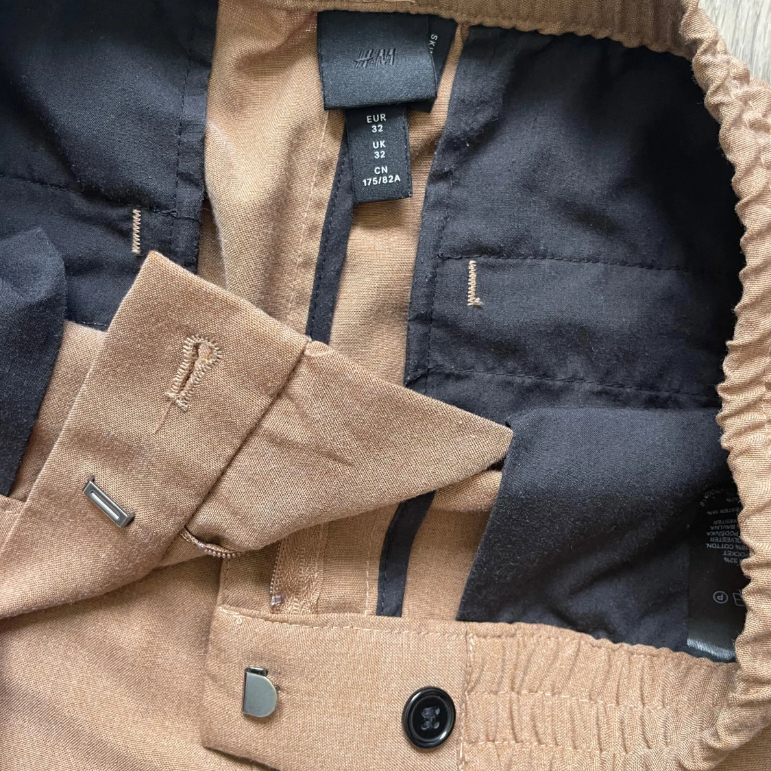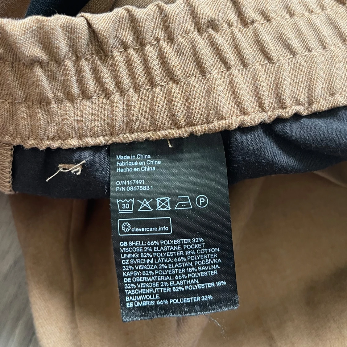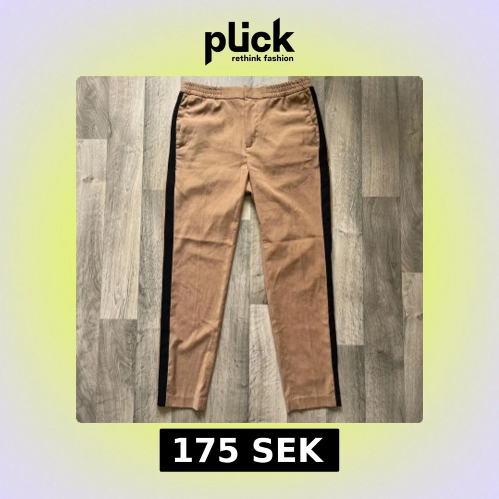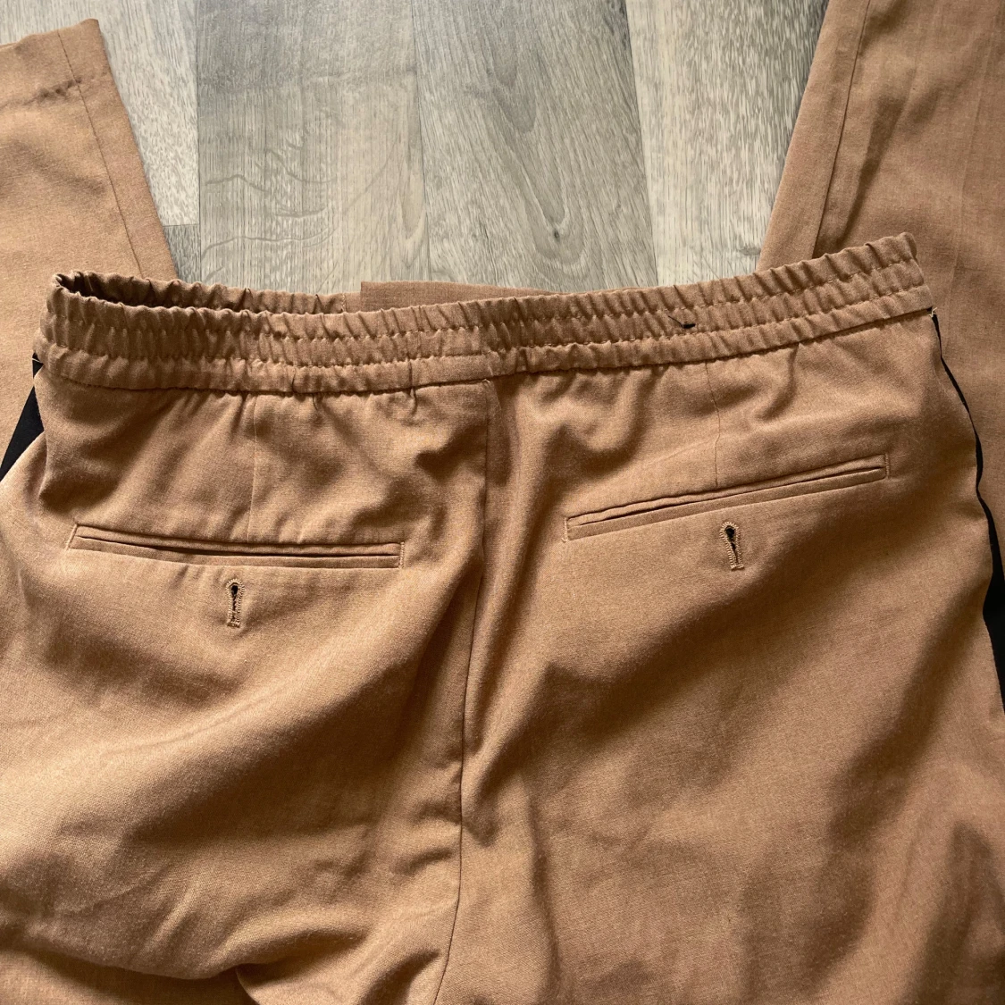 Snygga bruna byxor från H&M med svarta paneler längs sidorna. De har elastisk midja, raka ben och två bakfickor. Storleken EUR 32. Längden 98 cm, midjan 43 cm.