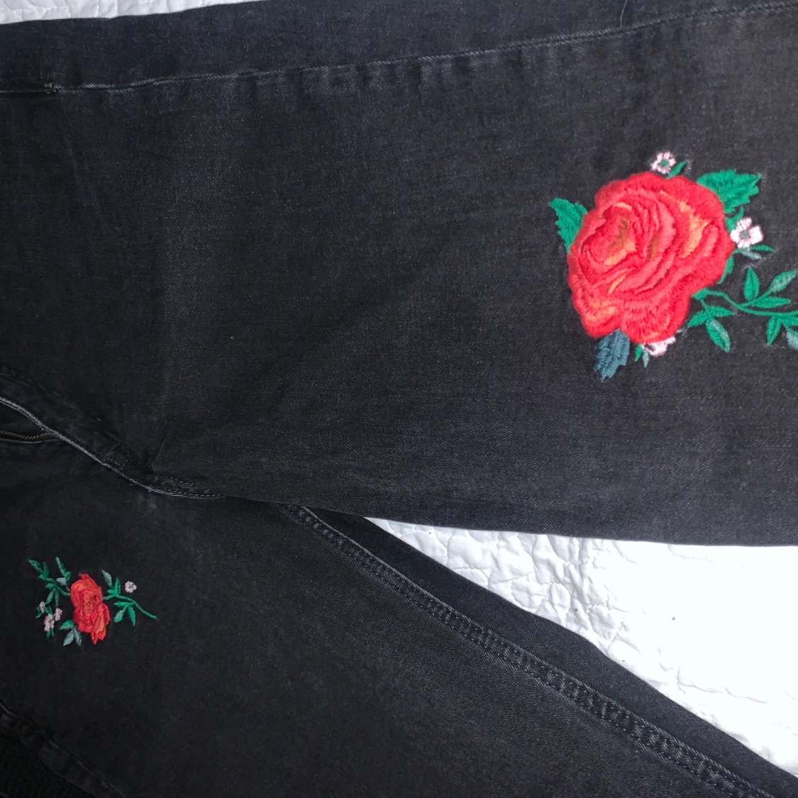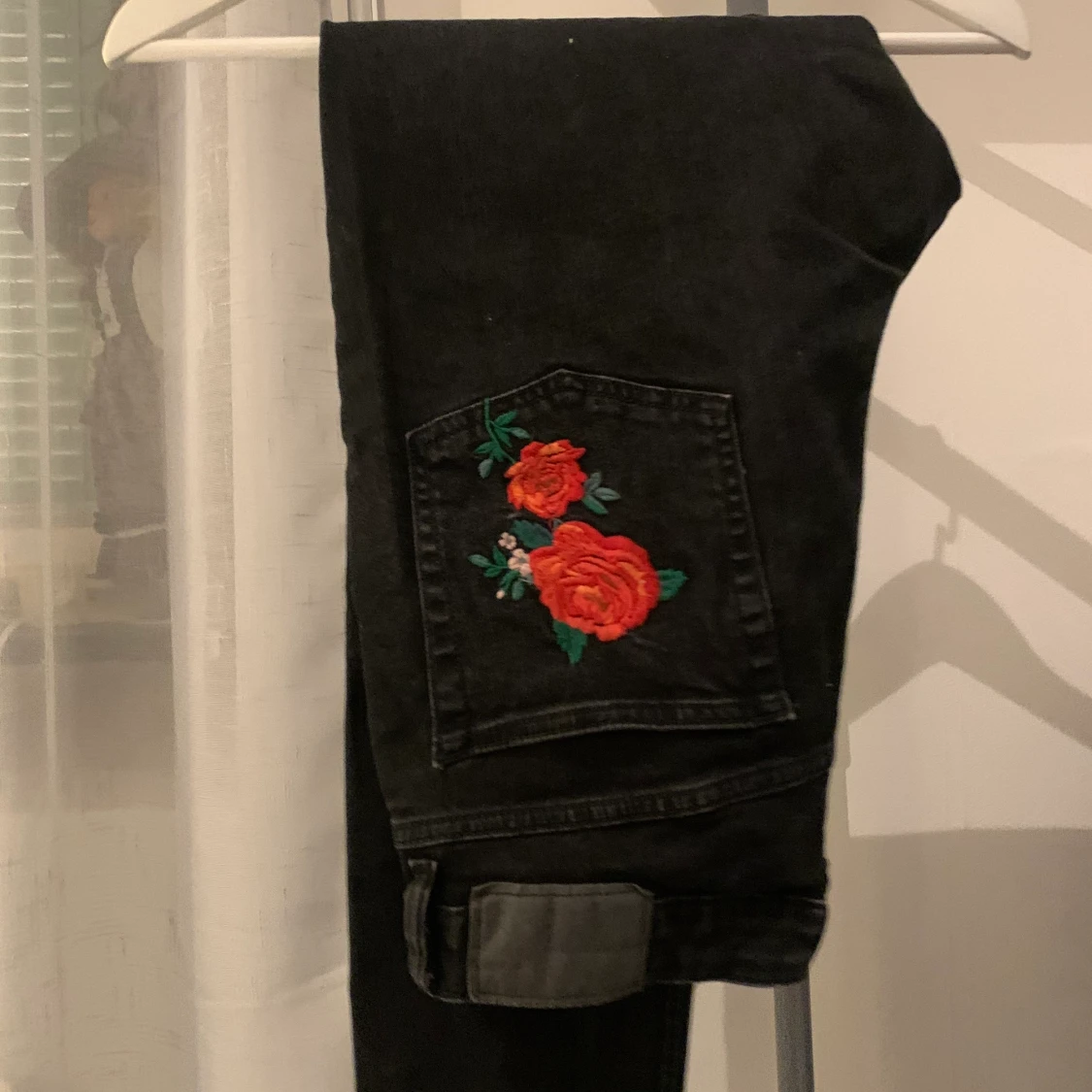 Jeans med rak modell med rosor på, passar 38-42 beroende på hur man vill att de ska sitta. Stretchiga och i jättebra skick!