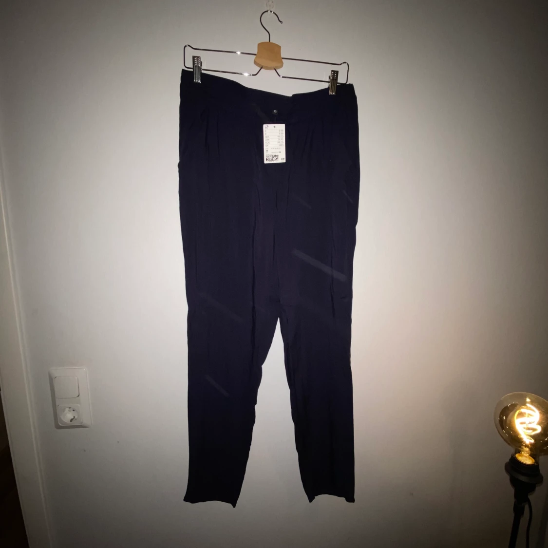 Tunna, mörkblå finbyxor med resår i midjan i stl 44 från H&M. Helt nya, prislappen sitter kvar. Kommer från djur- och rökfritt hem. Frakt tillkommer!
