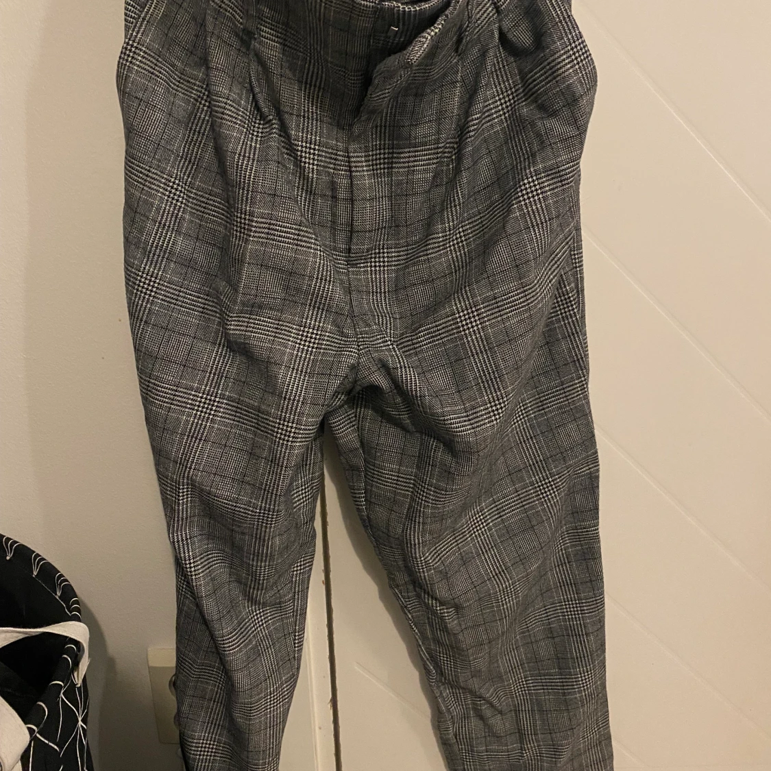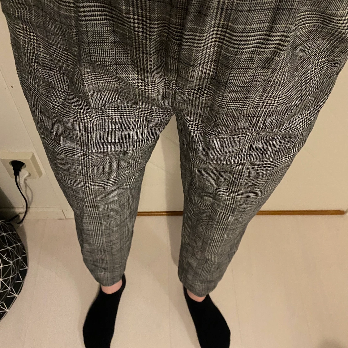 Grårutiga kostymbyxor från hm i storlek 34. De hade ett band runt midjan innan men har tappat bort det, funkar fint även utan.