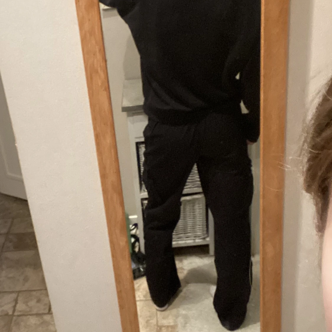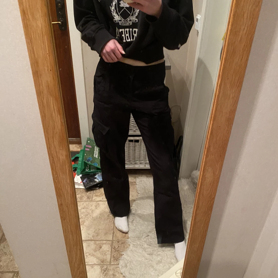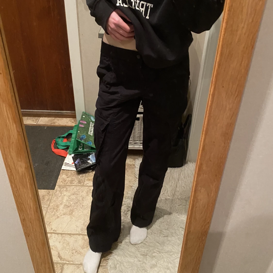 Svarta low/midwaist cargobyxor från H&m divided 💕Använda ca 3 gånger och har inga fel. Strl. 34/XS, jag är 170+ och byxorna nuddar nästan marken.