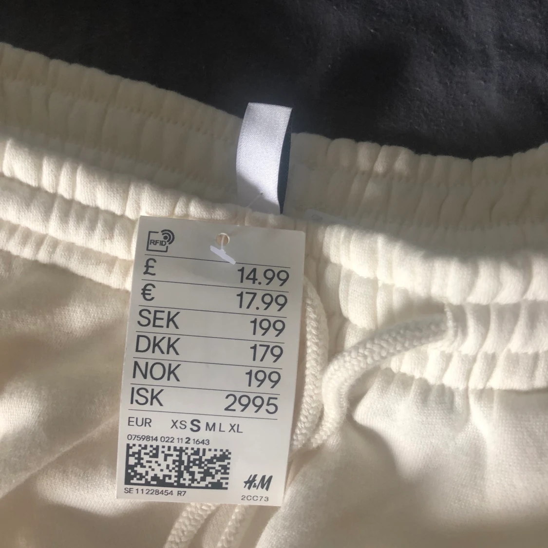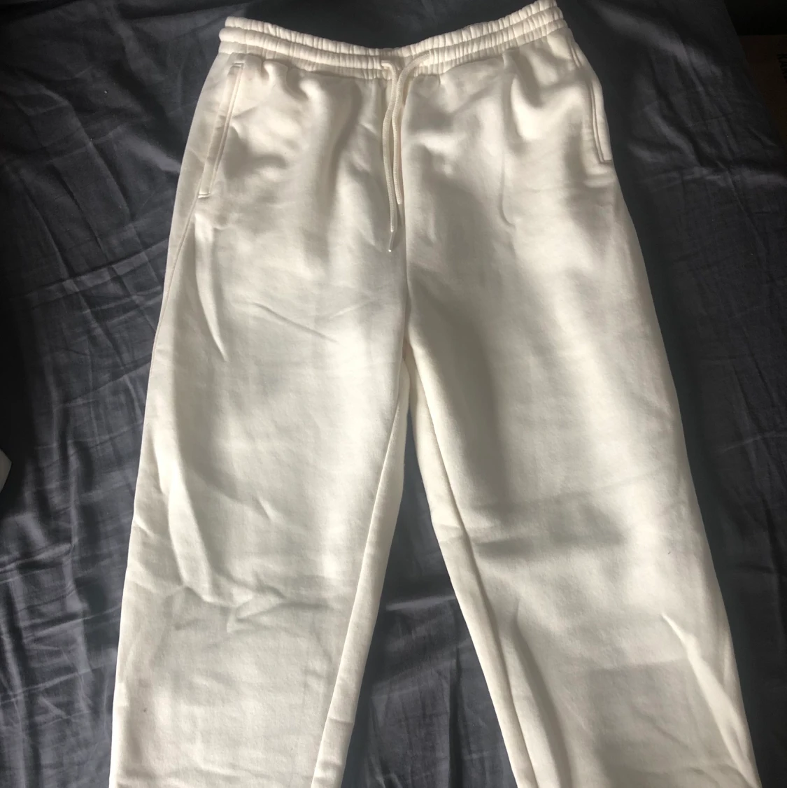 Krämvita mjukisbyxor helt oanvända med prislapp kvar💞🥰 finns småsmå fläckar uppe vid resåren men man ser det knappt, dom fanns där när jag köpte dom. FRAKT INGÅR🤩