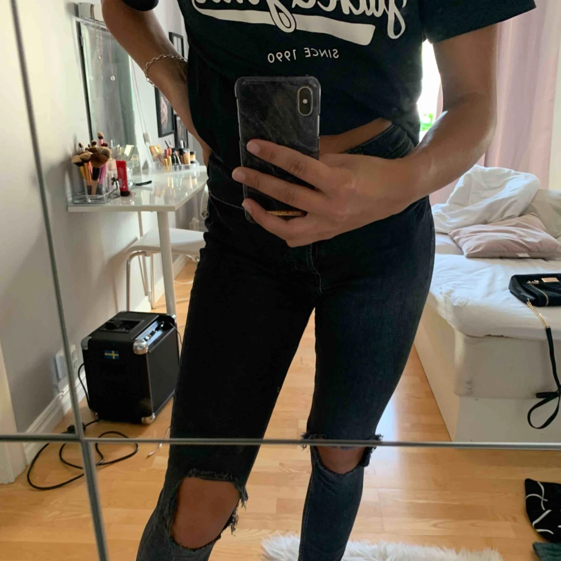Sköna och tajta jeans med hål på knäna. Gråa och högmidjade från hm. Står storlek 27 men skulle säga s-m. Frakt tillkommer