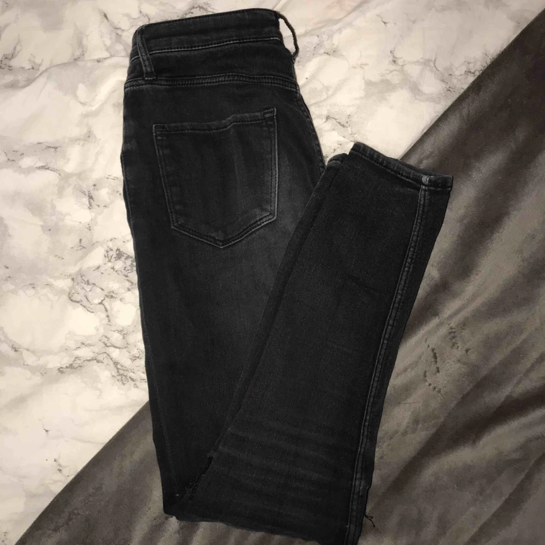 Sjukt fina svarta jeans som jag själv gjort hål på knäna💓passar en liten xs/xss, skicka ett meddelande för fler bilder💜