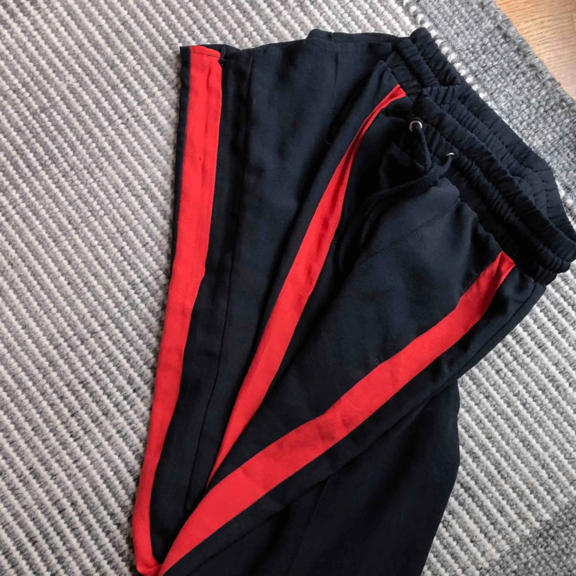 Skitsnygga mörkblåa kostymbyxor med röda streck på sidorna. Storlek xs/34 men passar både XS/Small. Jag är 175cm och inte för korta för mig om jag har de strax under midjan.